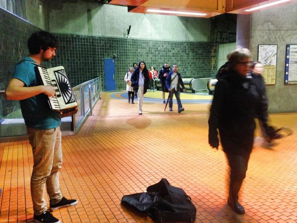 Plus tard dans l’après-midi, Julien Boudreault s’installe un étage plus haut avec son accordéon. Il a une maîtrise en biologie, deux emplois, et dans ses temps libres, il joue sous terre. “Aujourd’hui, c’est une journée pluvieuse. Je vais peut-être amener un peu de joie dans le cœur des gens!”