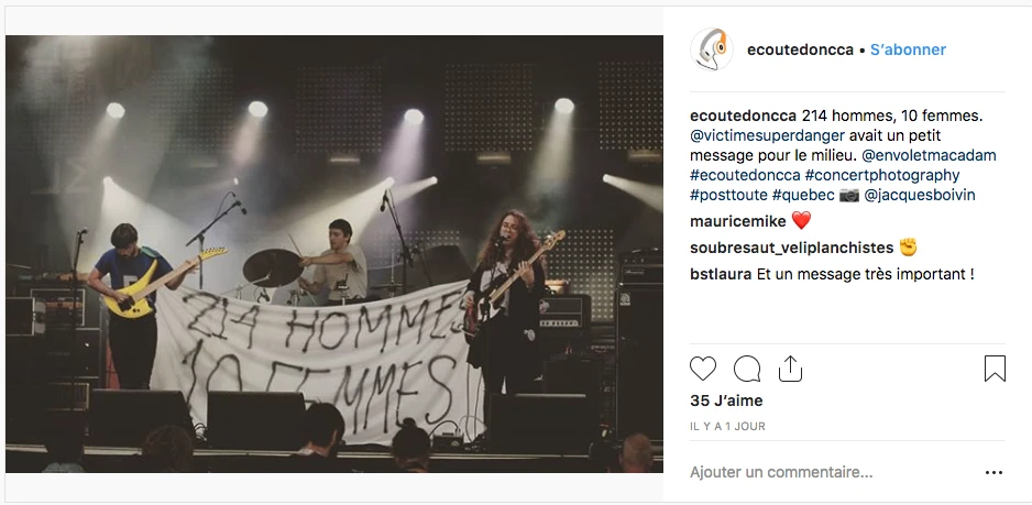 Sur celle-ci, le groupe de post-punk VICTIME brandit une affiche ou on peut lire « 214 hommes, 10 femmes». Le groupe, mené par Laurence Gauthier-Brown, a profité de son passage au festival Envol et Macadam de Québec pour passer un message très clair au milieu. « Des stats comme ça, ç’a pas rapport. »