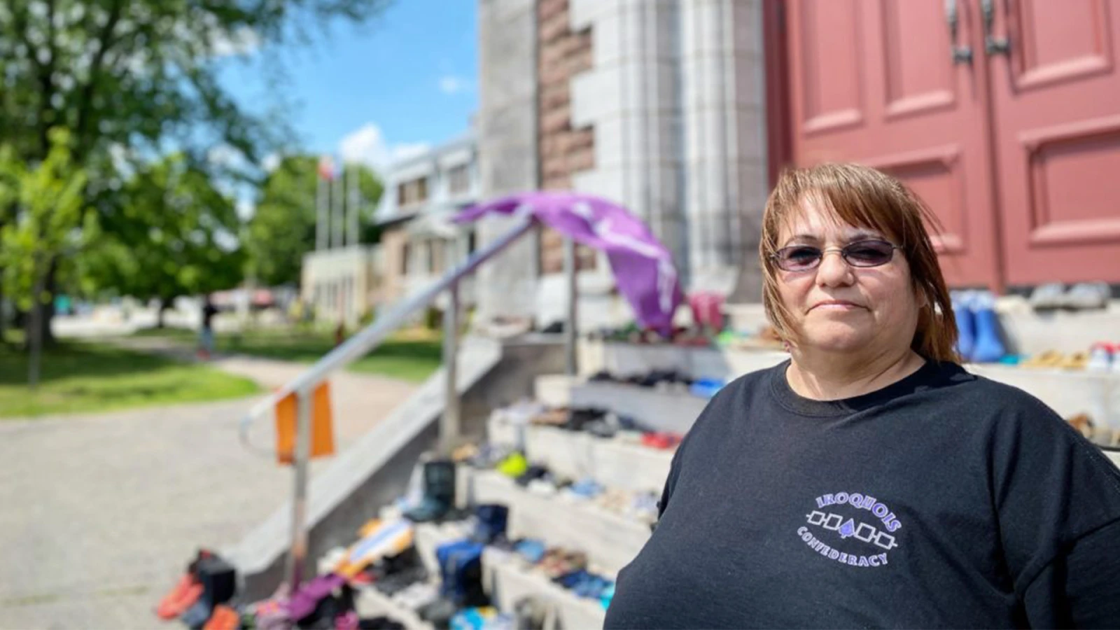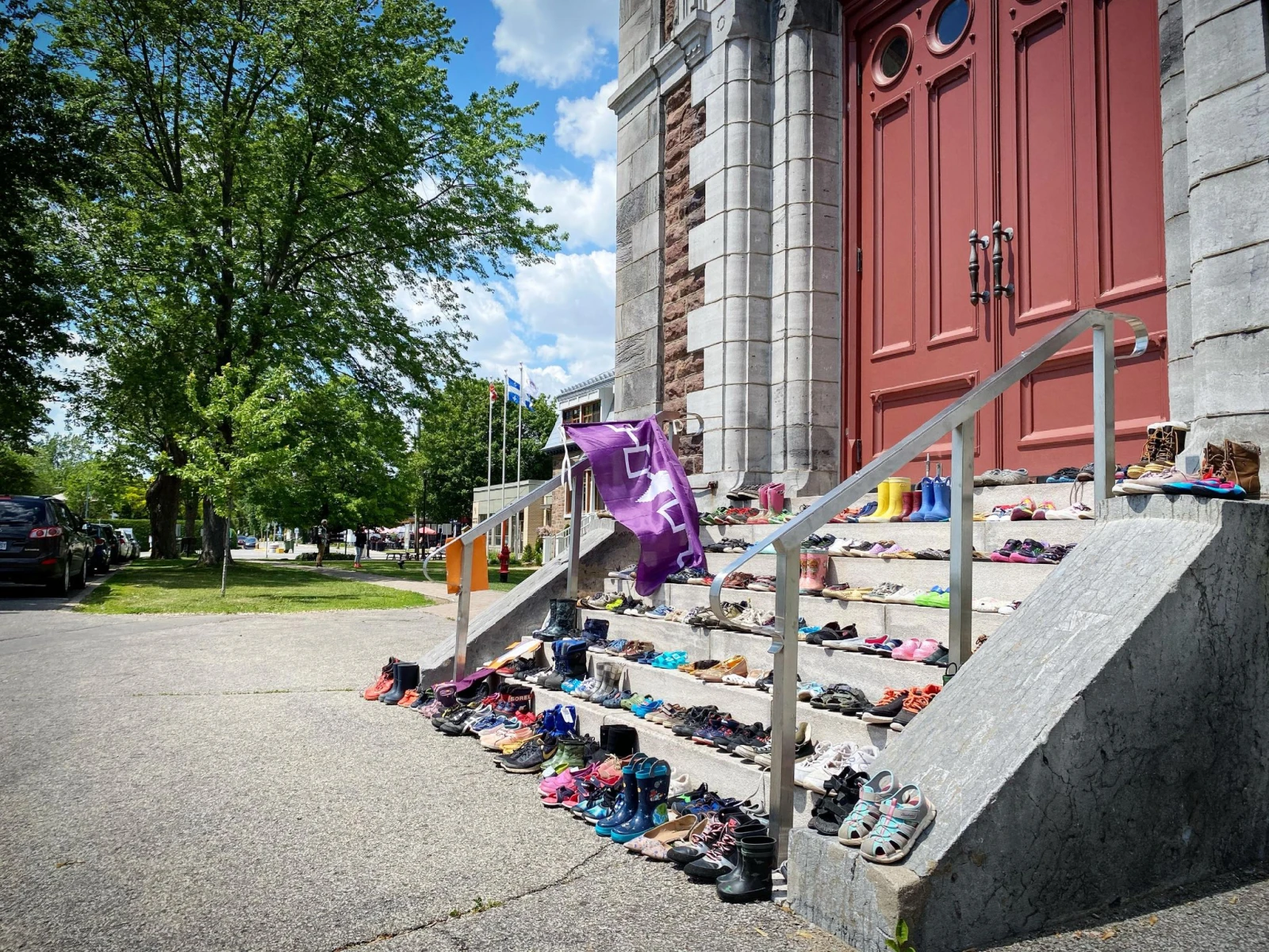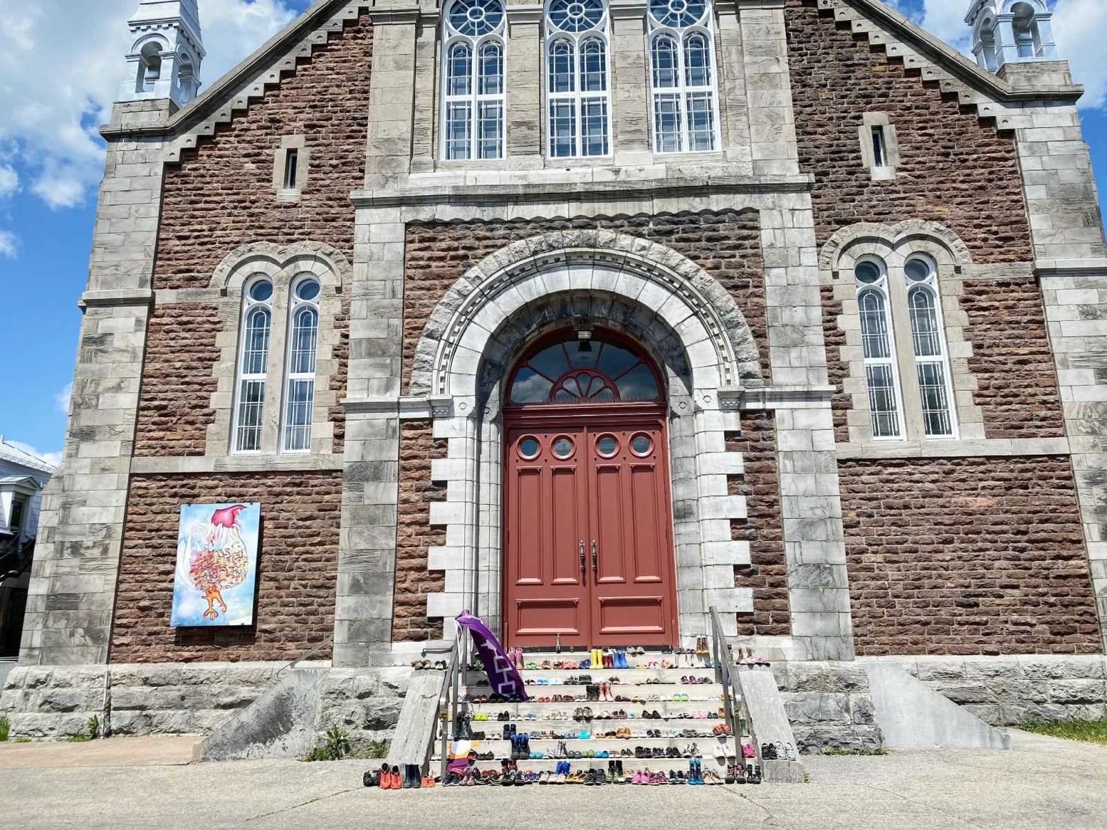 Sur le parvis de l’église d’Oka à côté de l’hôtel de ville, des dizaines de paires de souliers sont abandonnées dans les escaliers pour commémorer la découverte des restes de 215 enfants dans une fosse commune sur le site d’un ancien pensionnat autochtone de Kamloops, en Colombie-Britannique.