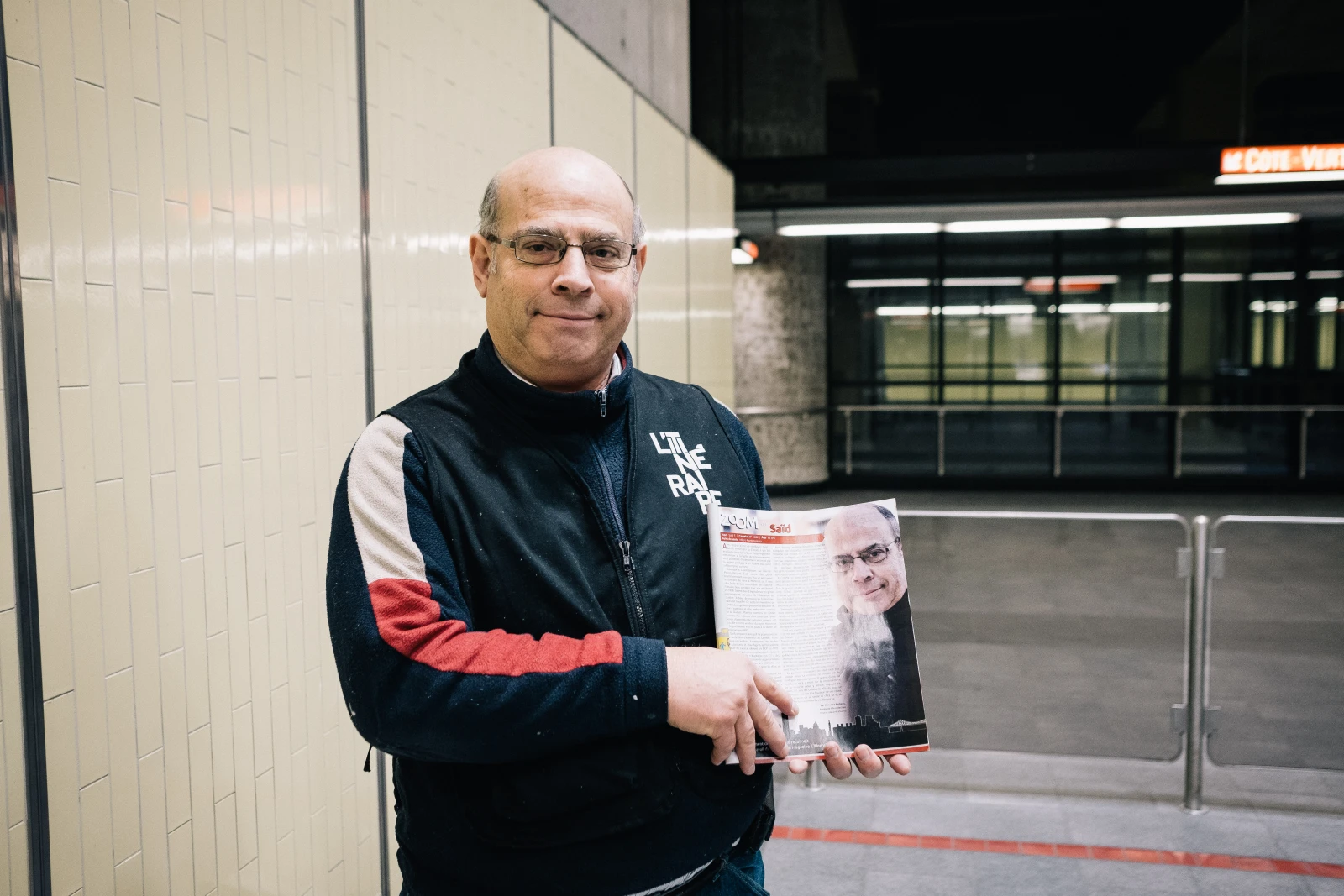 Sur le chemin nous ramenant vers la rame de métro, on croise Saïd, camelot de la revue L ’Itinéraire: «Ici, les gens sont magnifiques! Ils sourient, ils prennent le temps de jaser avec moi, ils achètent et encouragent ma démarche. Je vendais plus de revues avant, dans les métros du centre-ville, mais le monde était plus pressé; ça jasait moins. Alors je préfère être à Montmorency, même s’il y a de gros courants d’air froid et que la cafétéria de l’université vend ses repas ben trop chers. Imaginez… 7 dollars par plat!»