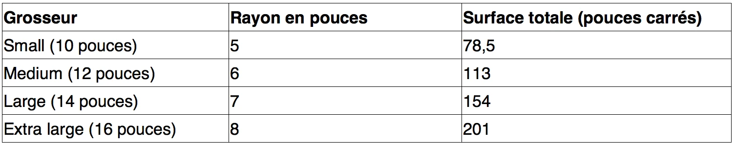 On sait que la superficie d’un cercle est π fois le rayon au carré. Cela signifie que l’aire de notre pizza n’augmente pas à la même vitesse que son rayon.