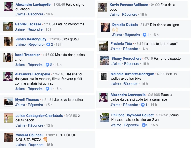 Un autre aspect de l’expérience était l’interaction en temps réel avec le public via les commentaires. Koriass demandait à ses fans de lui suggérer des éléments à intégrer au clip. Le vidéo a généré pas loin de 8000 commentaires. La chicane entre fans a aussi pogné quand une certaine Simone s’est mise à accaparer toute l’attention. Outre ce cyber crêpage de chignon, voici mes commentaires préférés: