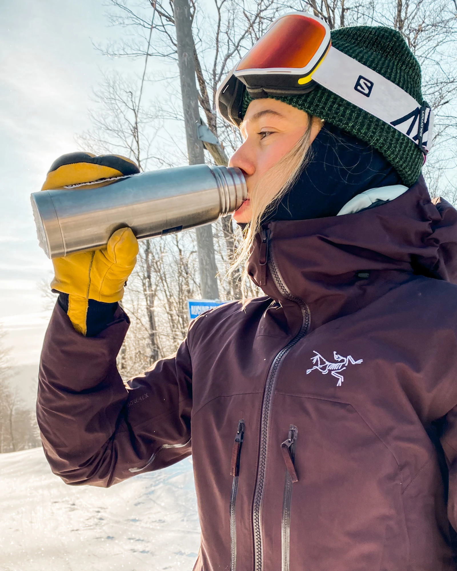 Ce n’est pas le choix qui manque : chocolat chaud, soupe en sachet, soupe maison, bouillon, thé, café, tisane, café comique, vin chaud, chili, cocktail chaud, etc. Oui, ça peut avoir l’air encombrant à première vue, mais je vous garantis qu’une fois que vous serez rendu.e en haut et que vous admirerez le coucher de soleil avec votre café Bailey’s, vous ne regretterez pas votre décision.