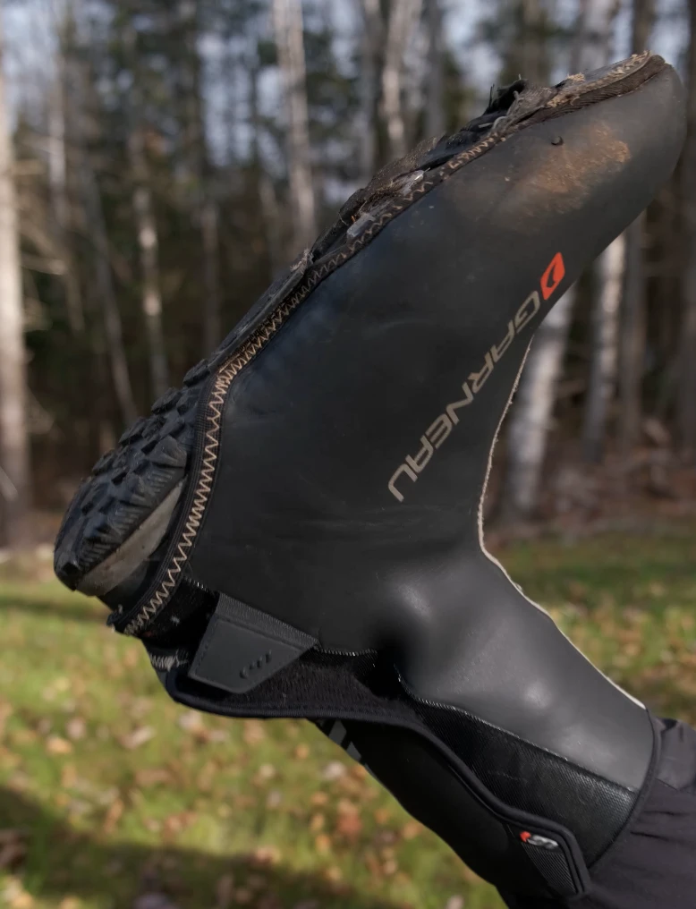 Quand il fait vraiment froid et que je roule longtemps, je choisis plutôt des souliers de randonnée sur des pédales plates, et je mets les couvre-chaussures en plus par-dessus. Ils sont assez résistants si on ne fait que pédaler avec eux, mais se défont ou déchirent assez rapidement si on marche avec. L’eau finit aussi toujours par entrer, par le dessus ou le dessous, mais, même mouillé, le pied demeure plus chaud, comme dans un wetsuit.