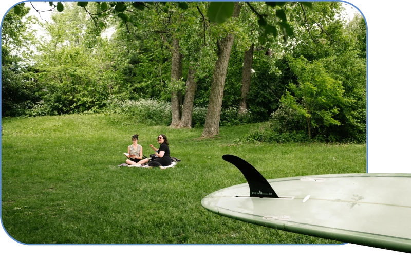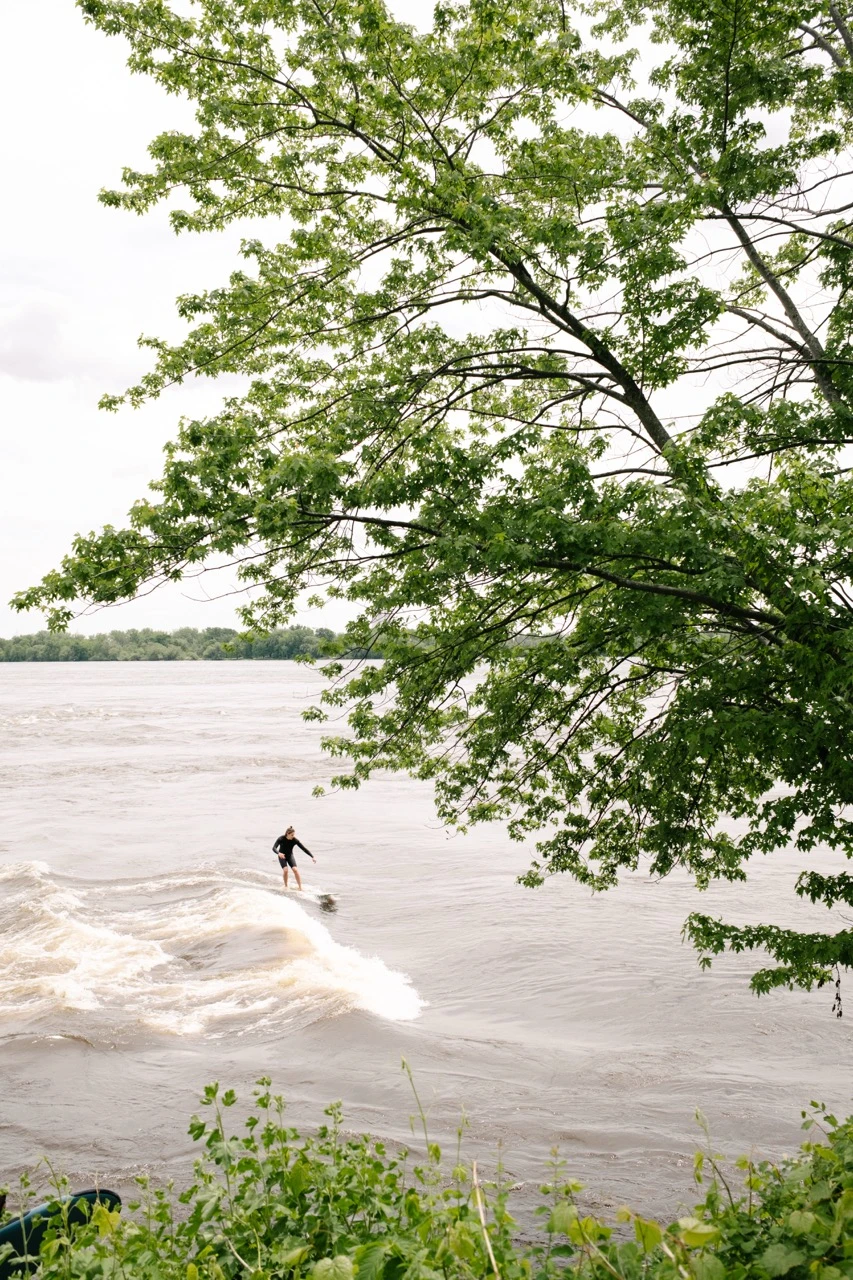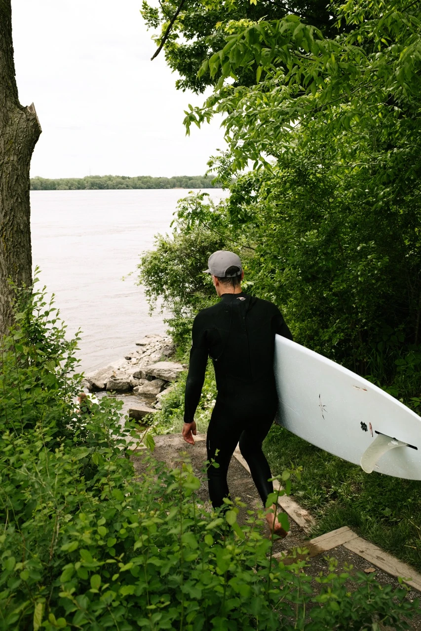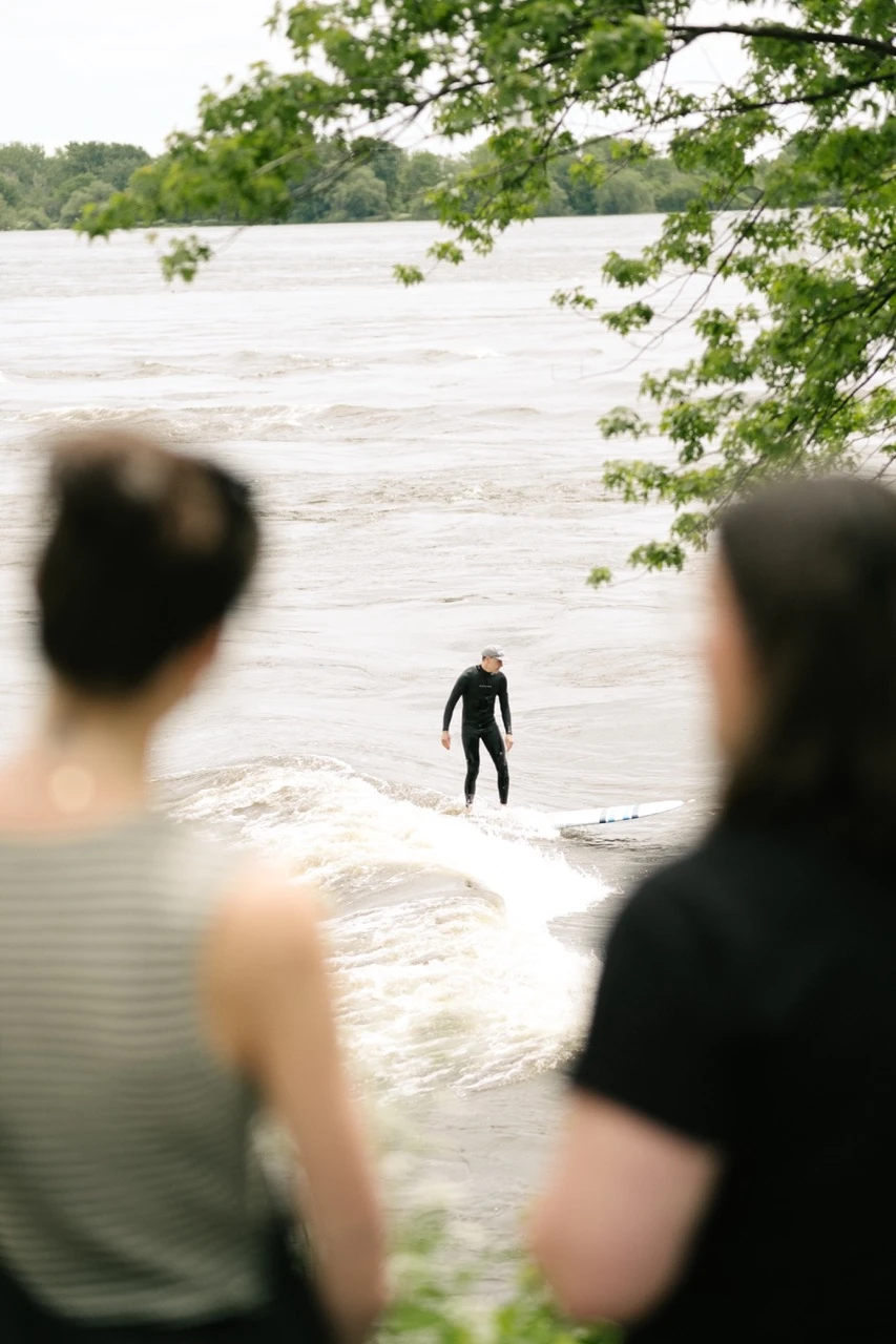 Pour commencer, on se donne rendez-vous à la Vague à Guy, à LaSalle, où des surfeuses et des surfeurs font des prouesses sur cette mythique vague éternelle. On les observe, café à la main.