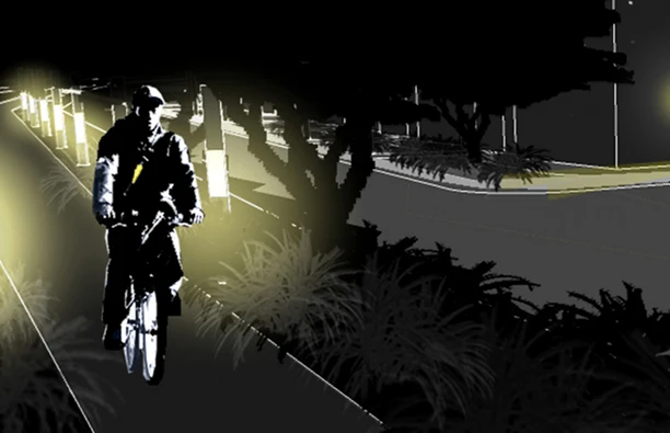 On remplace les piquets actuels sur les pistes cyclables par des poteaux contenant des panneaux solaires ainsi qu’un système de batterie et de détection du mouvement. Dès que le vélo passe devant le poteau A, le poteau B s’allume, assurant ainsi une continuité selon le mouvement du cycliste. Puisque les lumières ne restent pas allumées inutilement, elles conservent leur énergie. La localisation optimale des poteaux fait en sorte que la lumière frappe les réflecteurs des cyclistes, ce qui accroît leur visibilité.