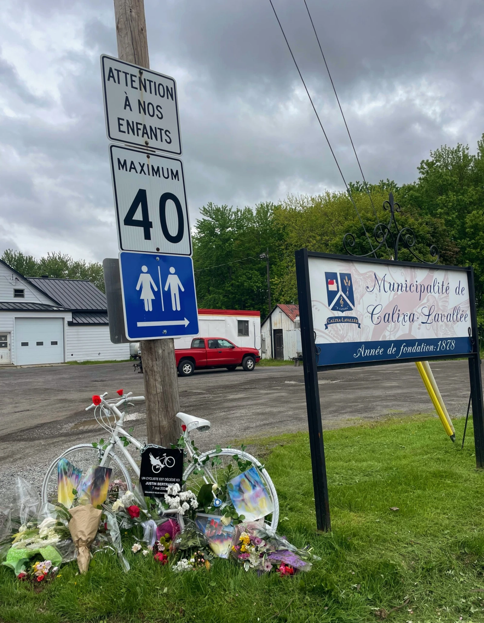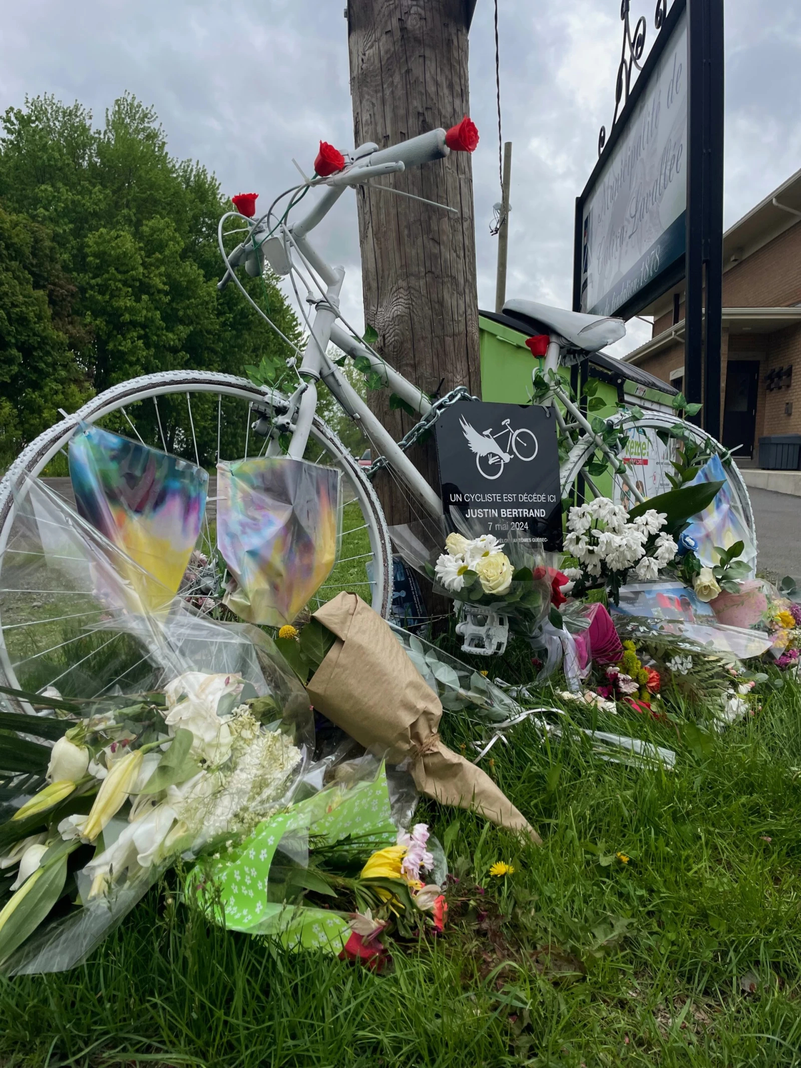 « Un cycliste est décédé ici. Justin Bertrand, 7 mai 2024 », peut-on lire sur l’écriteau accroché à un vélo blanc posé à la mémoire d’un jeune père de famille de 30 ans, décédé l’an dernier lors d’un accident de vélo survenu dans la municipalité de Calixa-Lavallée, près de Verchères, en Montérégie.