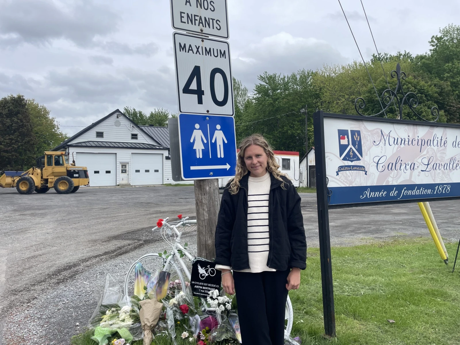 Je reprends le chemin de la mairie, où Camille Thibault se recueille en silence devant le vélo fantôme. Ça lui fait du bien, admet-elle. « C’est l’endroit où mon conjoint a passé les derniers moments de sa vie, c’est sûr que ça a un sens pour moi. C’est un tour de vélo qu’on faisait vraiment souvent ensemble. Aujourd’hui, que ça soit son lieu de décès, c’est sûr que pour moi, c’est pas évident », confie la jeune femme, la gorge nouée.