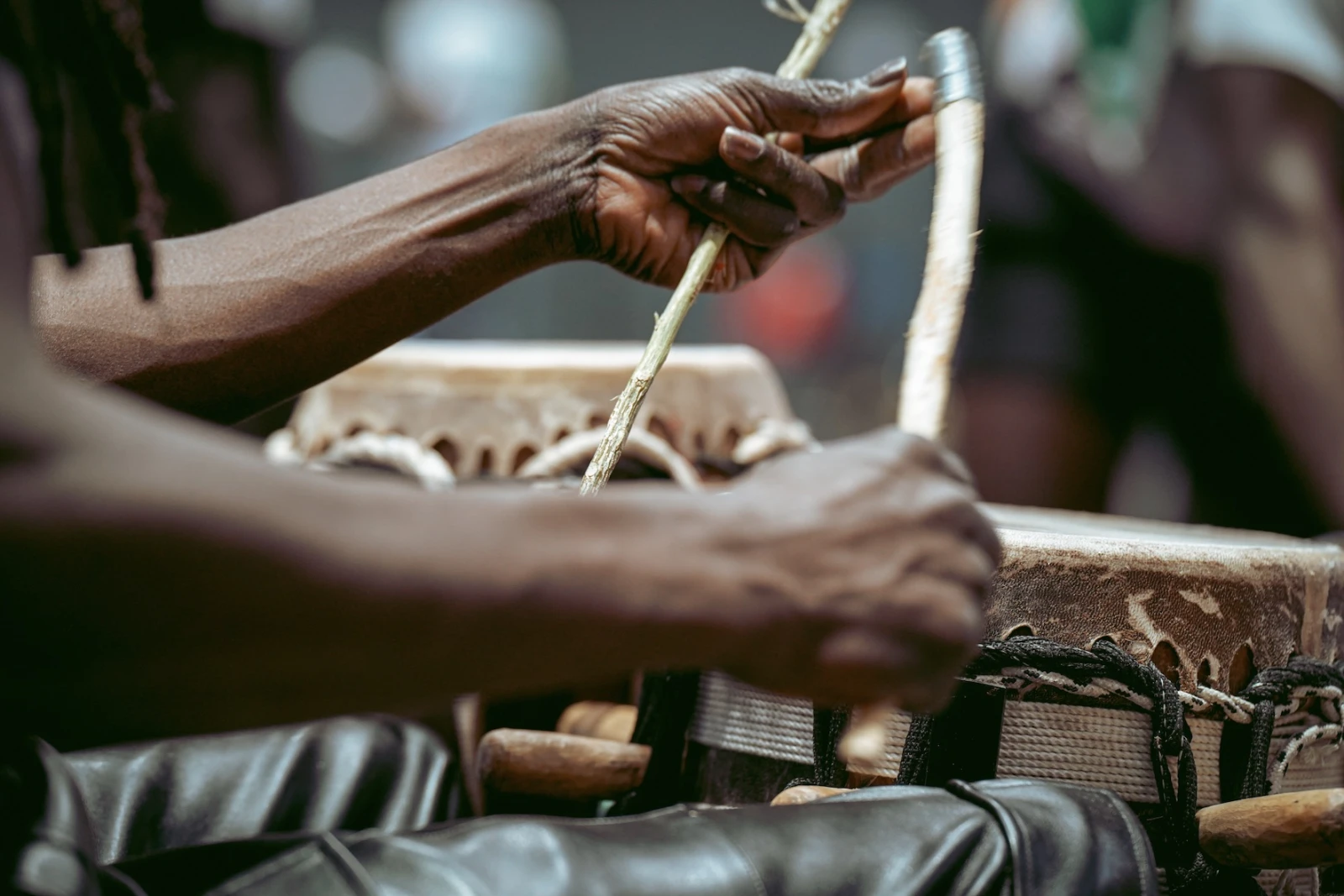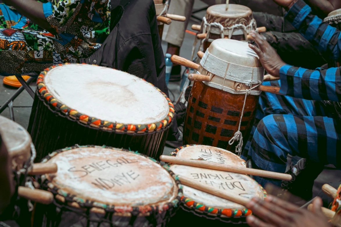 Parce que Boucar m’informe que « le cœur de la lutte, ce sont les tam-tams », je dépose mes affaires près du sabar — ces percussions qu’on appelle ici, simplement, les tam-tams. Autour, un cercle de griots : musiciens de père en fils, gardiens sonores d’une mémoire millénaire.