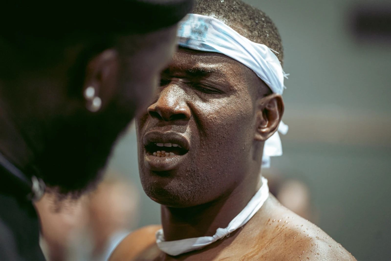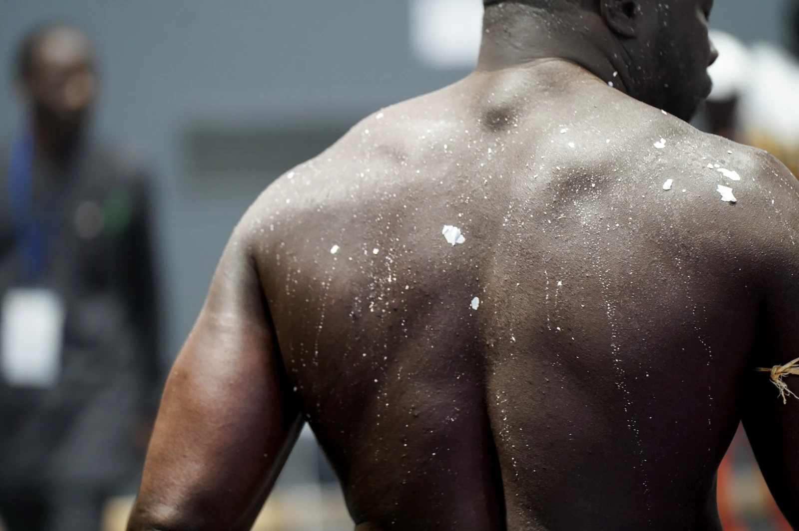 Avant chaque combat, les lutteurs s’enduisent le corps de différentes substances. Parmi elles, il y a cette argile blanche, fine et volatile. « Du kaolin », m’explique-t-on. Ces gestes ne relèvent pas du folklore : ils protègent contre le ndëp, soit le mauvais sort, les forces invisibles qui rôdent. Le sport cède la place au rite, l’arène devient temple, et l’animisme sénégalais s’invite, insaisissable.