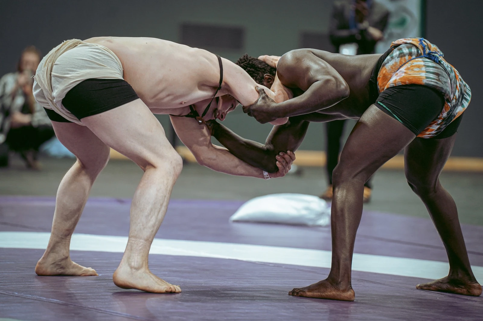 Là où notre culture nord-américaine s’acharne à tout minuter avec rigueur, ici, le léger flou des débuts, ponctué d’humour, d’improvisation et de danses, enveloppe l’événement d’une chaleur singulière. Ce flottement savoureux culmine enfin : les lutteurs font leur entrée, majestueux, portés par le chant des tambours.