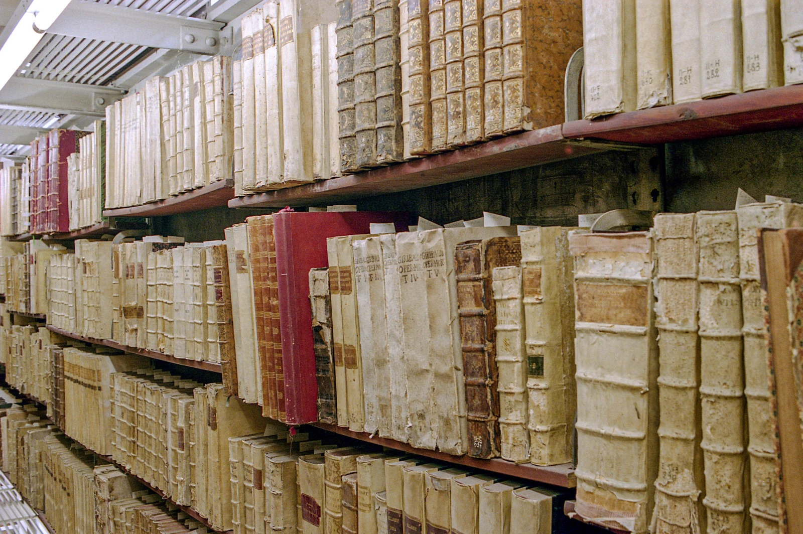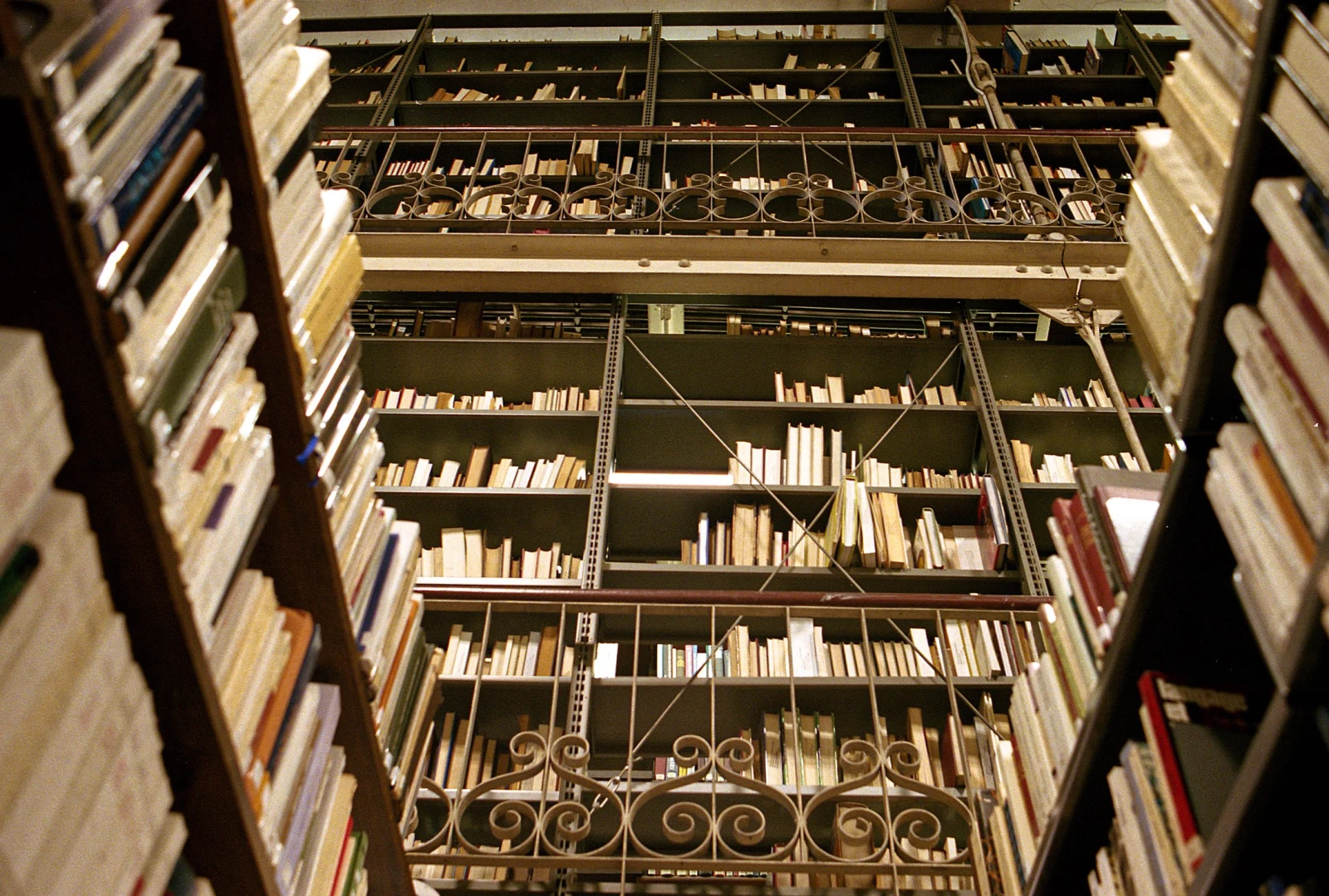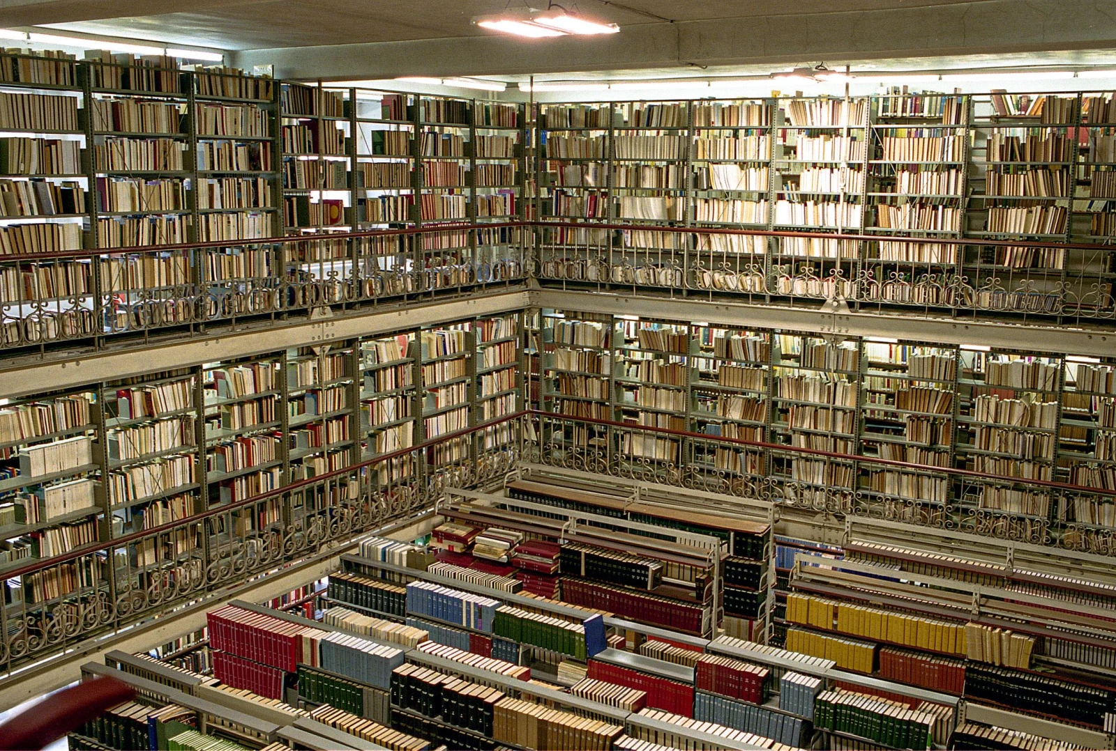 Les trois étages du haut s’ouvrent derrière une grille scellée à clé, où les photographies sont prohibées. Dans la voûte, l’odeur change, nos yeux s’écarquillent. Même s’il est permis de parler, contrairement à la règle d’or des bibliothèques habituelles, le silence est palpable. On se sent dans une nouvelle de Borges ou dans une scène de Richard au pays des livres magiques. Des milliers d’ouvrages anciens aux apparences de grimoire médiéval défilent sous nos regards béats.