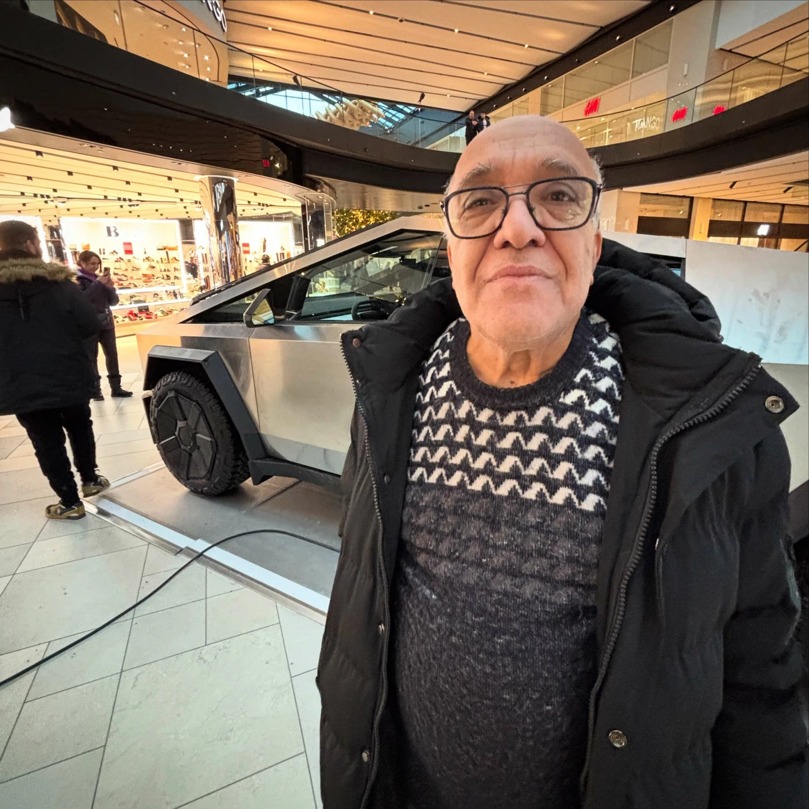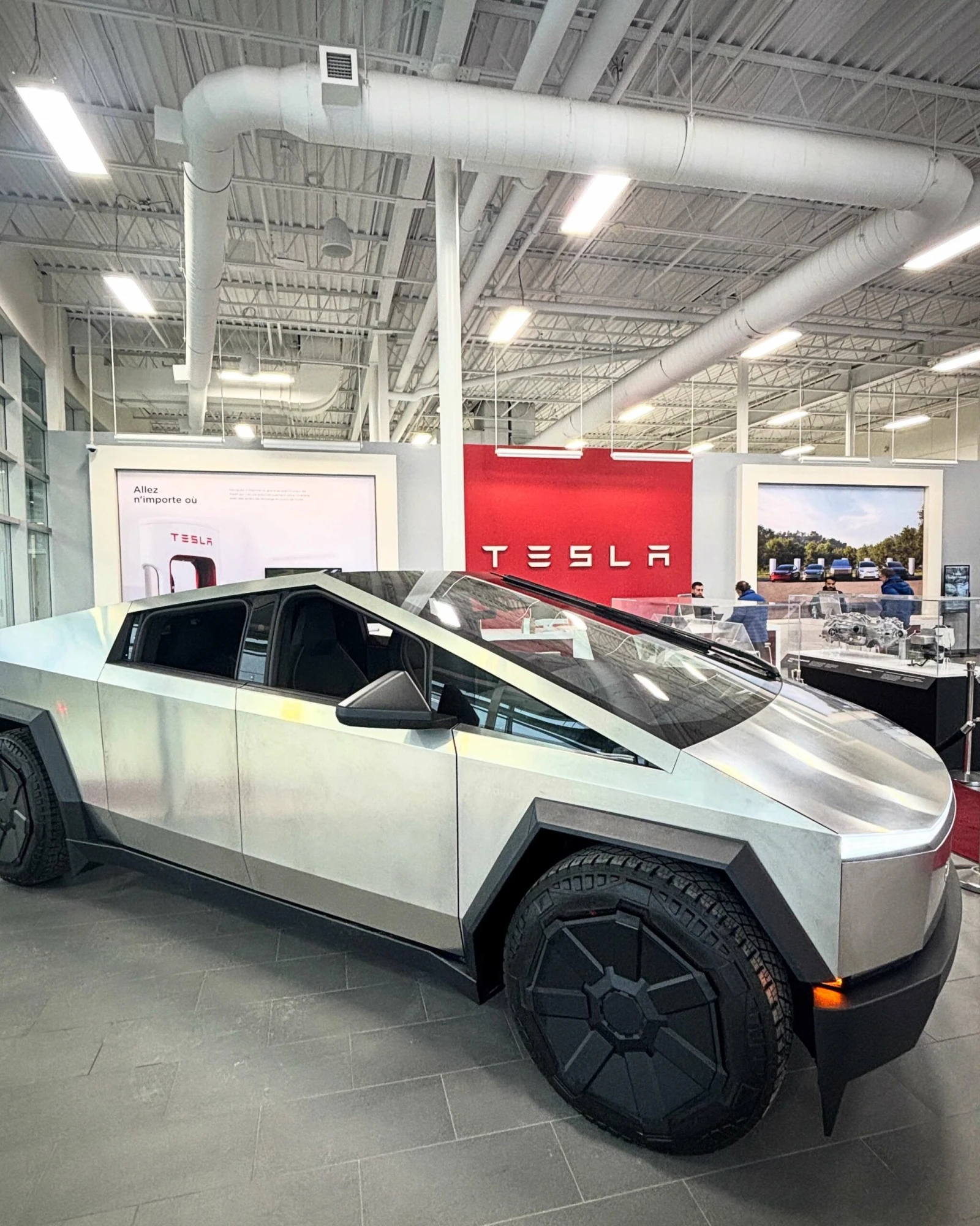De retour au Royalmount où un modèle de Cybertruck en démo entre un Sports Experts et un magasin de chaussures Browns attire les regards des passants.