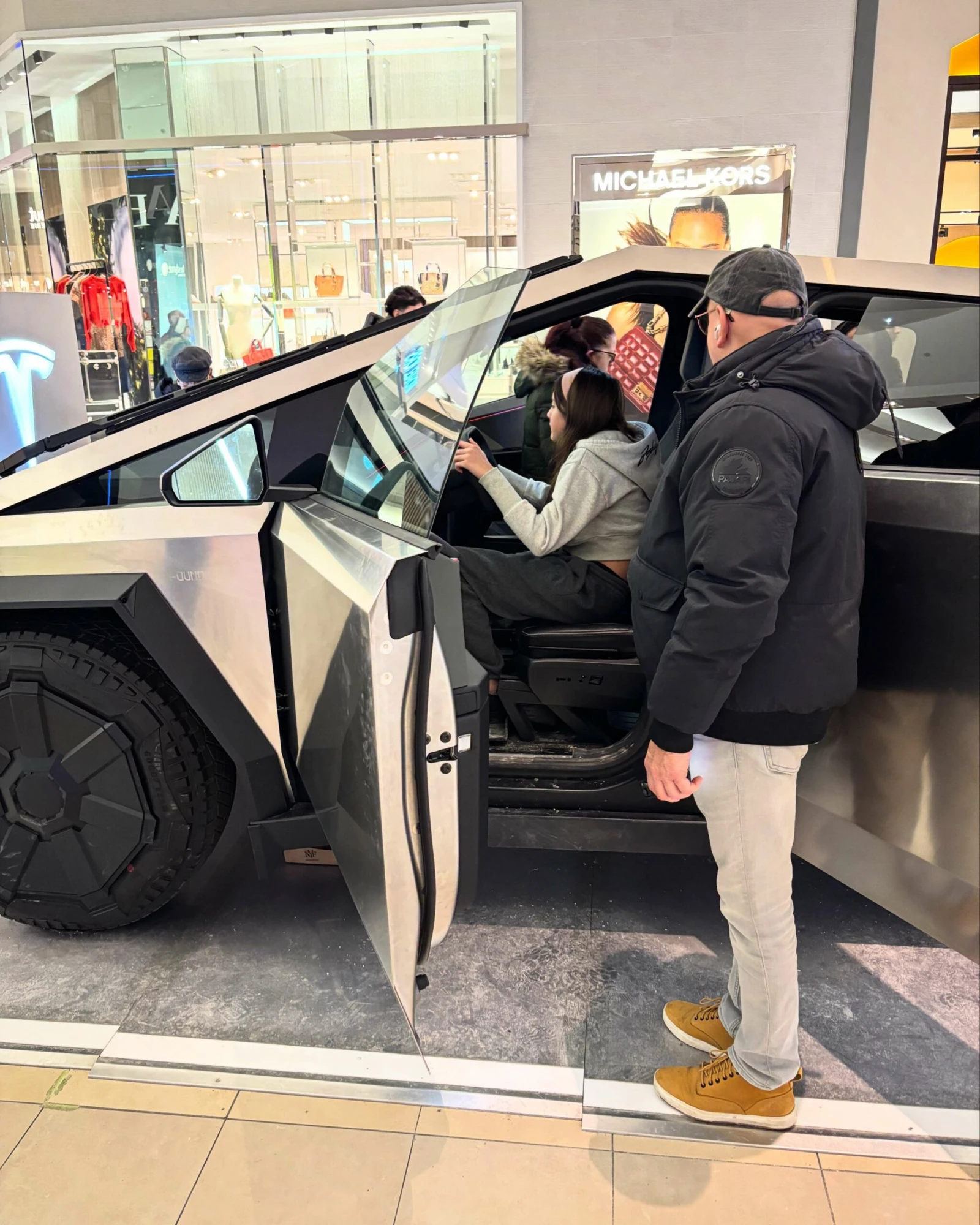 À l’intérieur du mail, le Cybertruck en démonstration fait courir les foules. Les gens sont nombreux à se photographier devant, à s’asseoir dedans, et à jouer avec les vitres électriques.
