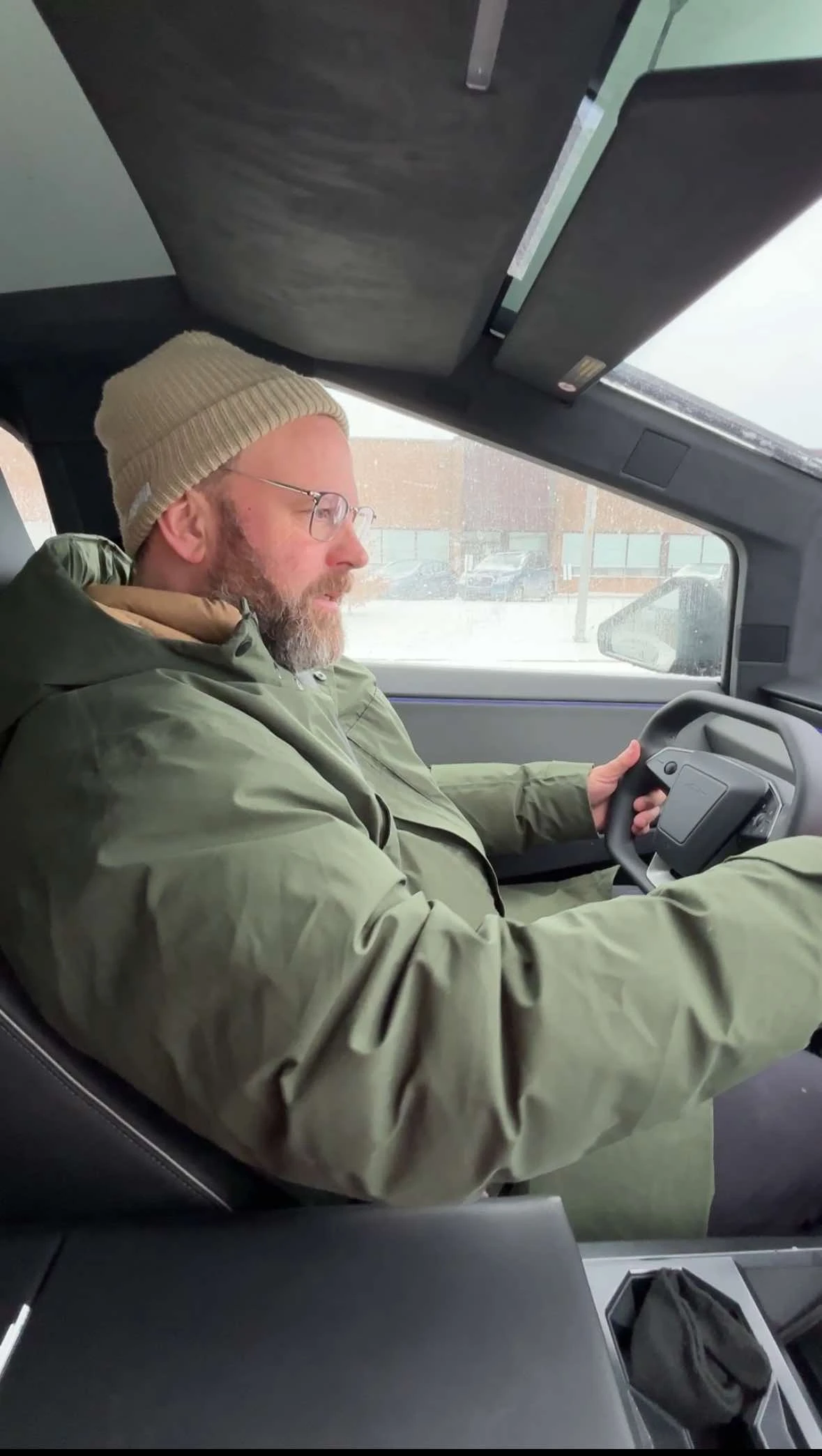 En roulant dans le quartier, il me raconte avoir patienté cinq ans avant d’avoir son camion. Ça faisait déjà dix ans qu’il conduisait un véhicule électrique, mais il avait besoin d’un pickup pour charrier du stock. Au début du mois de novembre, Jean s’est joint à la trentaine de personnes qui ont pris possession de leur Cybertruck à Laval.