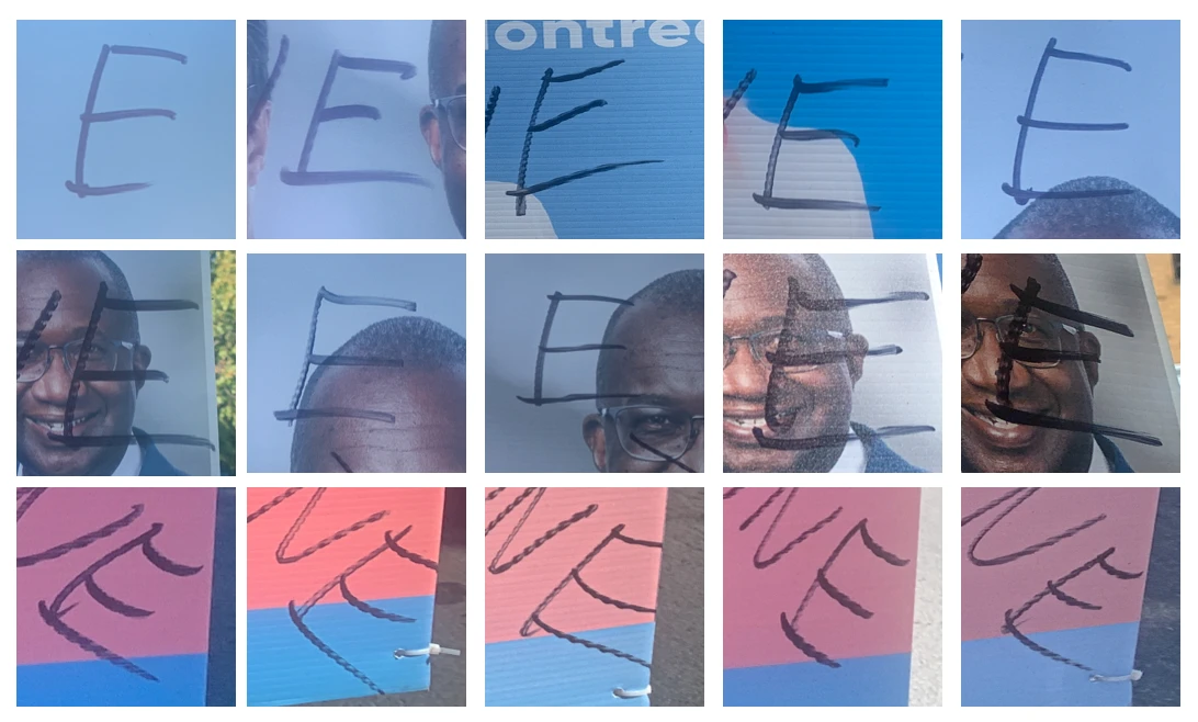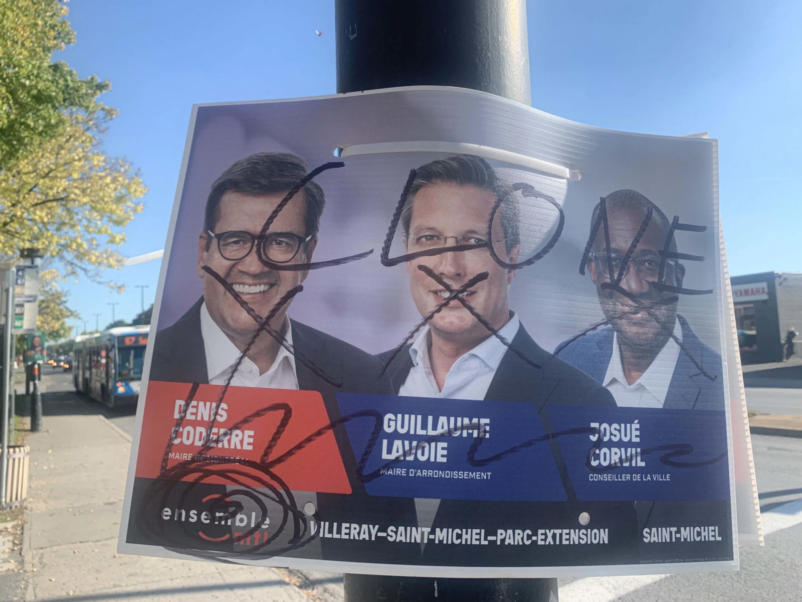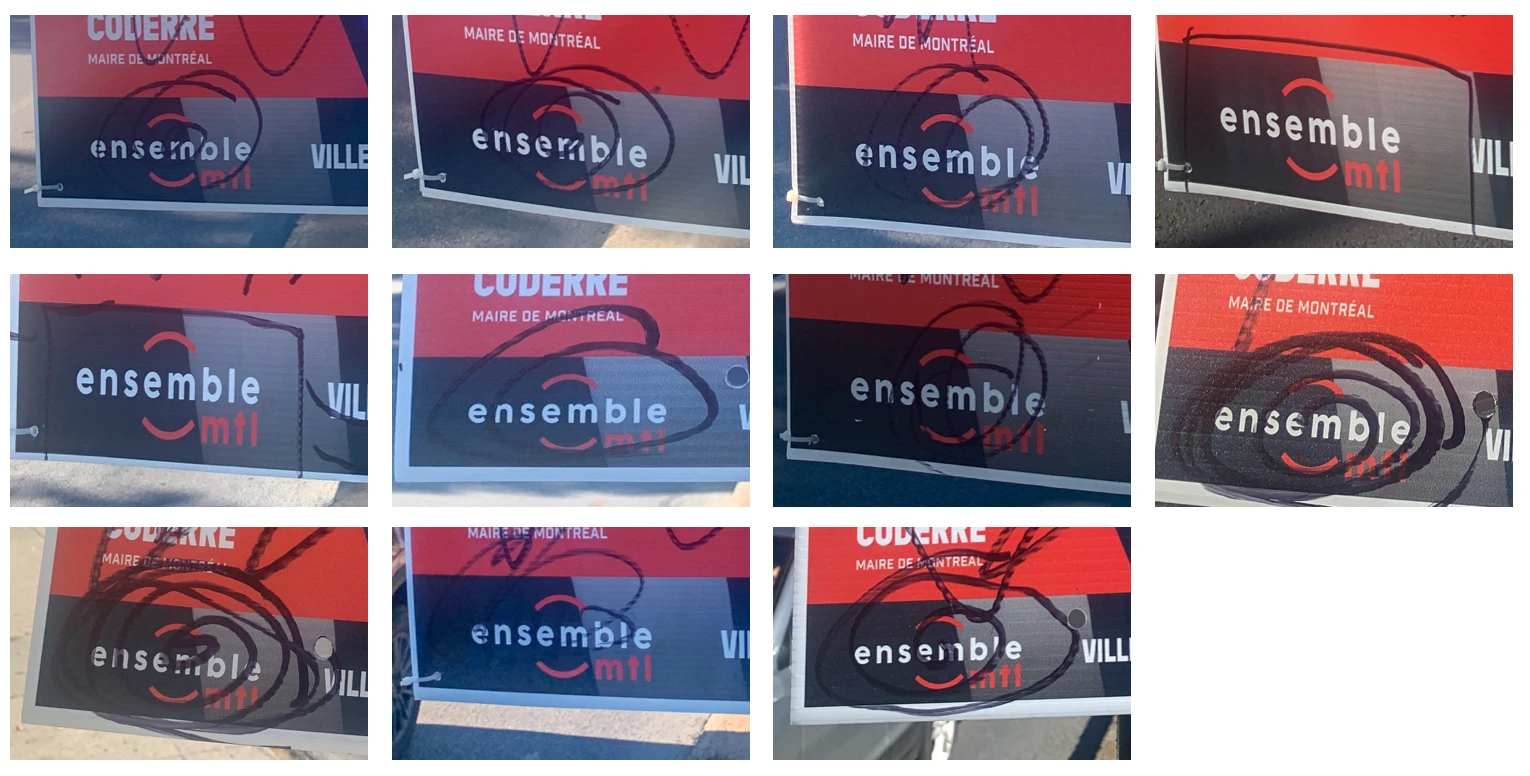 L’investigation commence à l’angle de Jarry et Saint-Michel. À travers les élèves qui attendent l’autobus, j’aperçois une affiche du parti Ensemble Montréal barbouillée. Rien de bien étonnant. Au coin opposé, une autre pancarte arbore les mêmes cicatrices caractéristiques. J’avance sur Saint-Michel direction nord. Une troisième, une quatrième, toutes similaires.