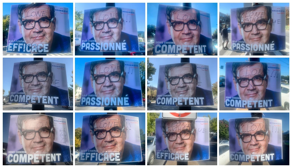 Selon l’activiste au Sharpie, l’ex-maire Denis Coderre n’est pas compétent ni passionné ou efficace (comme l’indique ses pancartes), il est un clone synthétique. Le message prend au dépourvu. À une époque dévorée par la désinformation et le complotisme tous azimuts, la mythologie du clonage détonne.