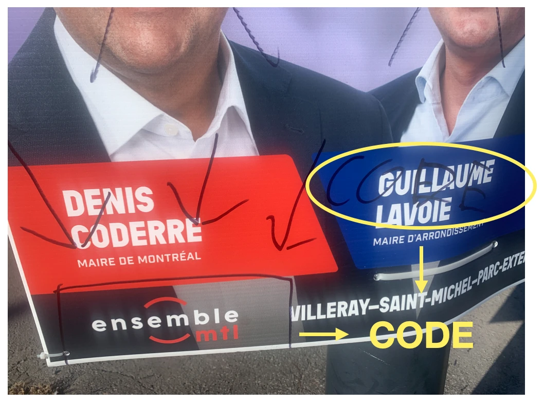 Une affiche près de Louvain offre un indice aussi obscur que rafraîchissant. On peut identifier l’inscription « CODE » pointant Ensemble Montréal. Le code génétique, criminel, source? Le code d’une énigme, d’un grand puzzle? Tant d’interrogations pour si peu de réponses.