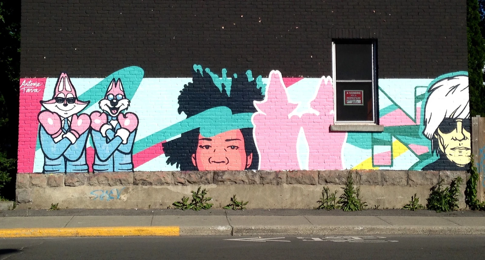 “C’est une murale que je viens de faire au coin des rues Bellechasse et Châteaubriand, dans la Petite-Patrie à Montréal. J’ai cogné à la porte du propriétaire et je lui ai dit que j’aimerais peindre son mur. C’est un hommage à Basquiat et Andy Warhol. J’ai pris mes personnages du renard et du chat, et je les ai peints avec des gants de boxe, dans la même pose que la photo de Basquiat et Warhol. J’aime prendre des éléments de la culture populaire, du pop art, pour en faire une interprétation personnelle. Je suis inspiré par les couleurs, les tendances et la mode, comme pouvaient l’être ces artistes à leur époque, qui étaient de véritables influenceurs.”