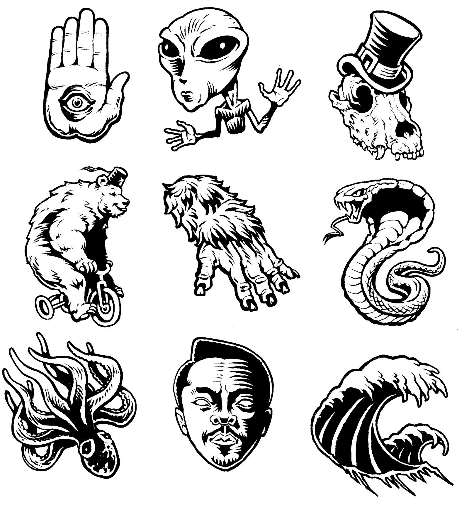 Son travail comme designer graphique a également eu une influence majeure sur son œuvre, au même titre que sa passion pour les bandes dessinées, deux éléments qui l’ont poussé à ne travailler presque exclusivement qu’en noir et blanc. “C’est devenu une sorte de signature pour moi. J’ai toujours aimé le noir et blanc. Ça me vient des BD, mais aussi des sérigraphies que j’ai pu faire. Quand tu imprimes quelque chose sur un t-shirt, ça passe mieux quand tu n’as pas beaucoup de couleurs, et pas trop de détails. Ça m’a aussi poussé à simplifier mes créations artistiques.”