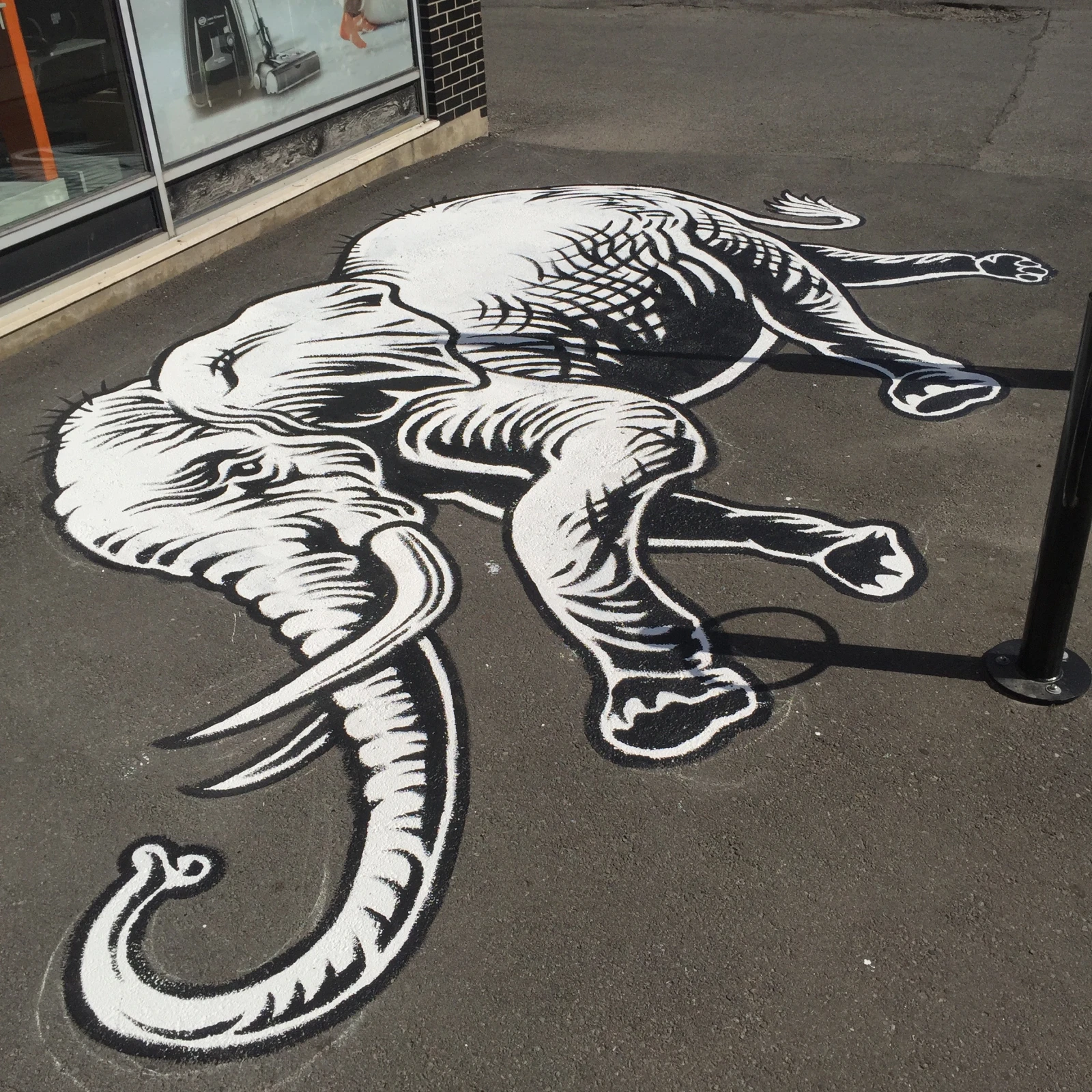 “C’était à Saint-Léonard il y a 2 ou 3 mois, il y a avait une vente de trottoir sur Jean-Talon. LNDMRK, qui s’occupe du festival Mural, m’avait engagé pour faire des peintures sur le trottoir pour différents commerces. L’un d’eux était La maison de l’aspirateur, et leur logo était un éléphant avec un aspirateur à la place de la trompe. Donc, je me suis dit, pourquoi pas faire un éléphant sur le trottoir? Il a un peu l’air d’un éléphant qui aurait été créé par le Dr Seuss. J’aime beaucoup faire des animaux. C’est simple, mais c’est le fun de les humaniser un peu, de leur donner des impressions humaines dans un esprit très cartoon.”