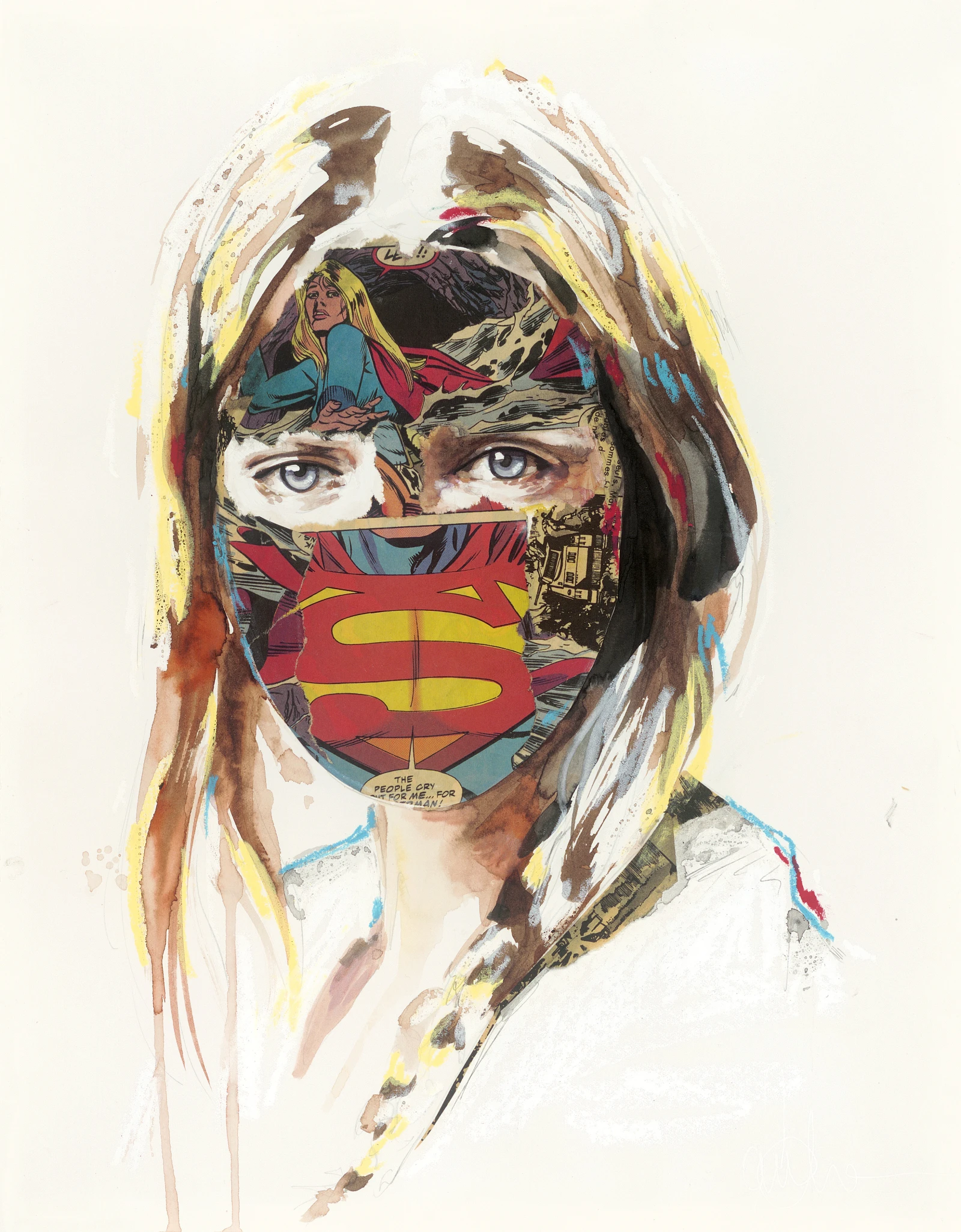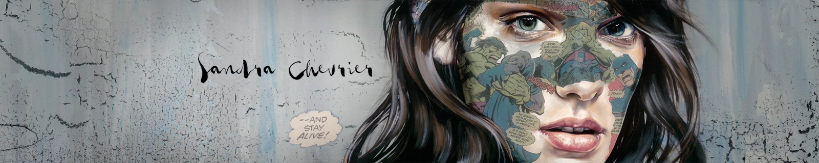 Révélée au monde entier grâce aux réseaux sociaux, Sandra Chevrier est surtout connue aujourd’hui pour sa série des “Cages Super-Héros”, ces portraits de femmes auxquels elle ajoute des images de comic books, à travers de subtils mélanges de collages et de peinture.