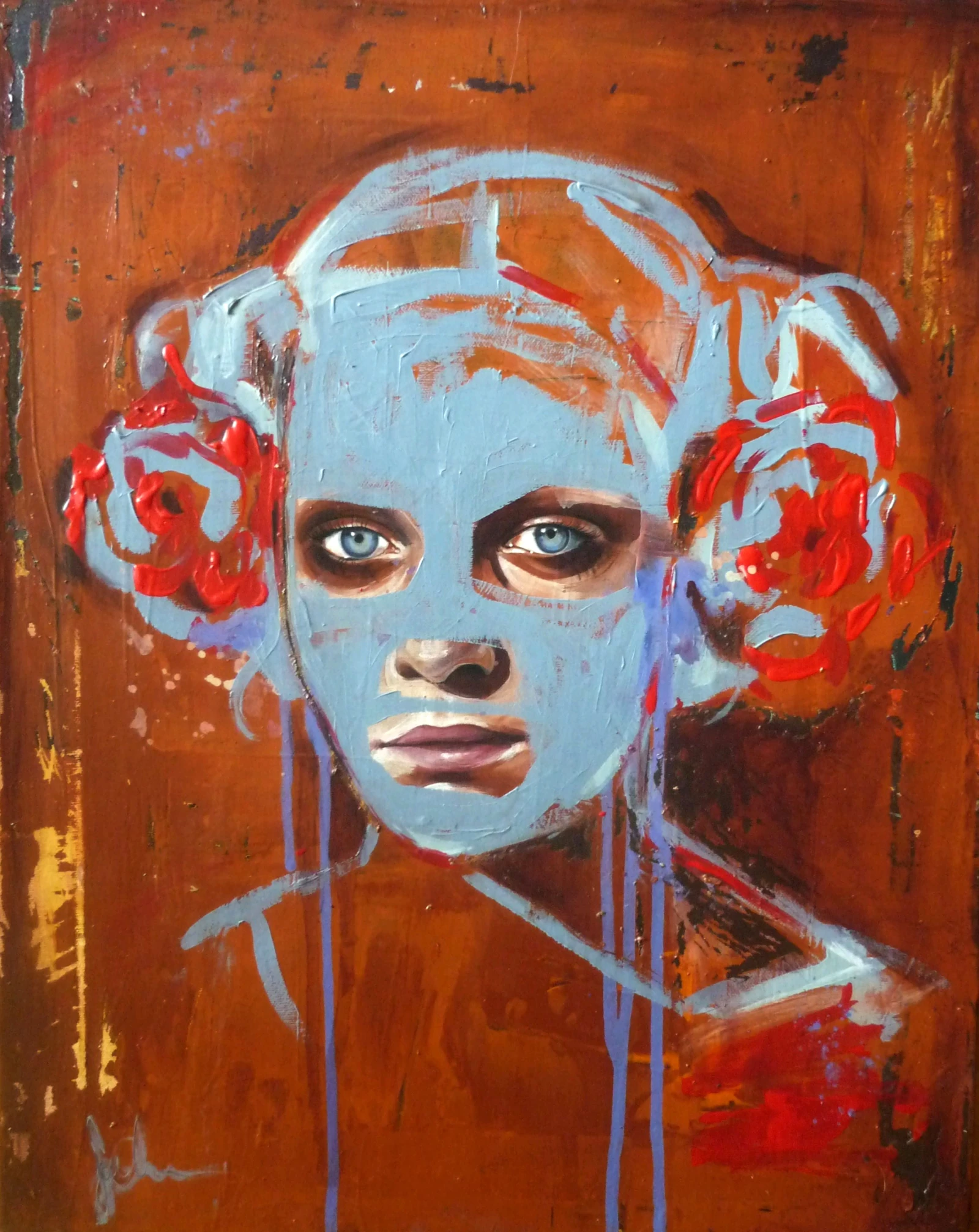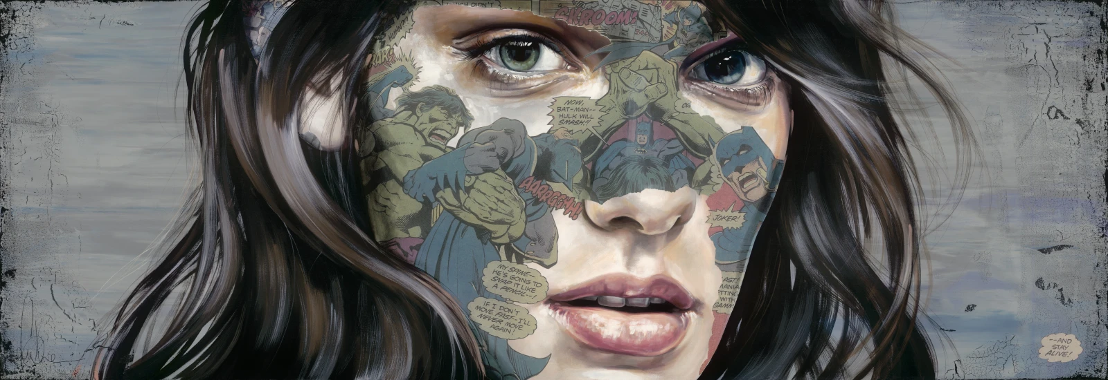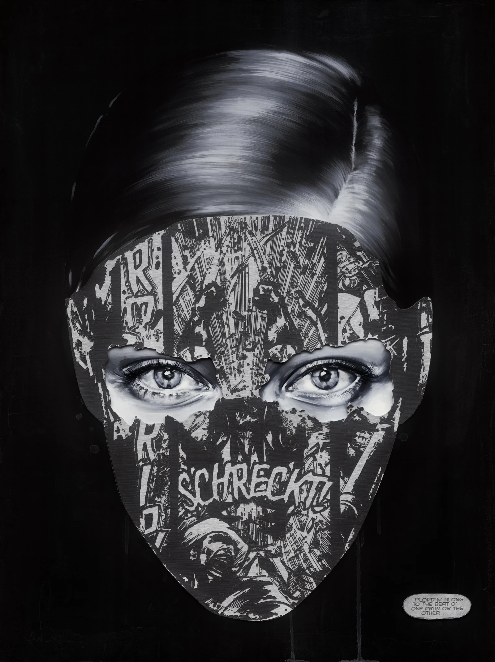 “Après quelques esquisses préparatoires, je transpose sur canevas mes personnages mélancoliques et énigmatiques. Ces portraits sont muselés par des masques graphiques extraits de bandes dessinées américaines, ce mimétisme symbolise ces prisons sociales où elles cachent leur véritable identité. Mes œuvres font se confronter le dynamisme tiré des onomatopées, des couleurs vives et de la victoire face à la grisaille de la défaite et de l’émouvante fragilité du Héros.”