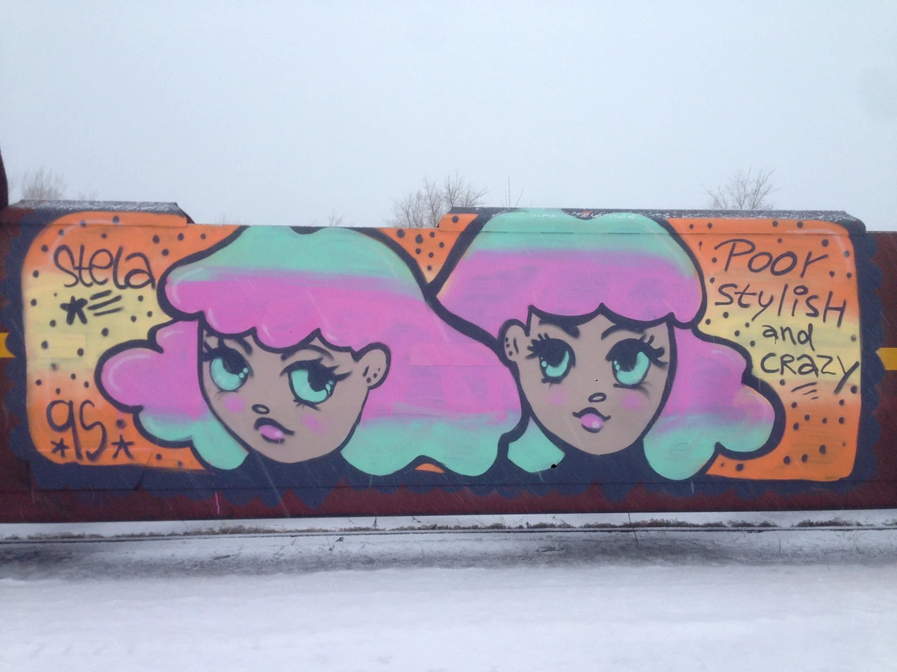 “Je ne suis pas fan de l’hiver, mais j’essaie tout de même de peindre à l’extérieur, malgré le froid et la neige que je déteste. L’hiver pour moi, c’est une gerçure et j’étais sûrement de mauvaise humeur ce soir-là, quand j’ai peint cette œuvre. La citation ‘poor, stylish and crazy’ est un hommage à une personne extravagante de mon entourage qui est décédée l’été dernier. Quand quelqu’un que j’aime meurt, je fais une partie de mon deuil en créant des pièces en leur mémoire.”