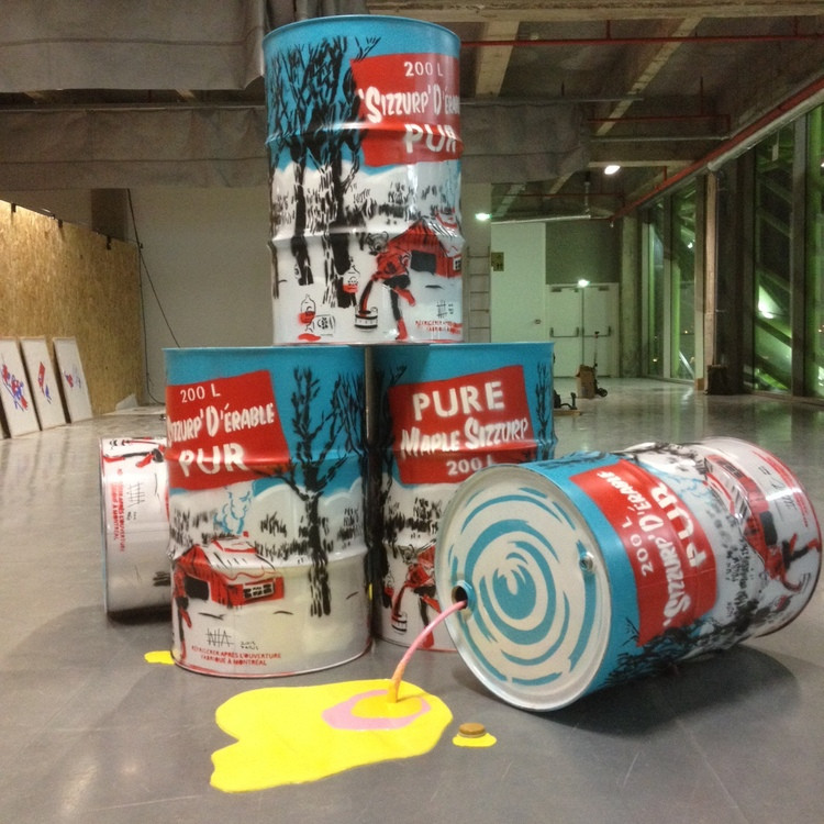 S’il voyage beaucoup, WIA reste toujours très influencé par sa terre d’origine. “Je suis surpris qu’il y ait si peu d’artistes québécois inspirés par le Canada. Après avoir visité chacune des capitales du Canada, j’ai commencé à penser beaucoup à ce qui représente notre pays : la faune, les couleurs, les icônes, la nourriture…” Avec lui, le street art a comme un goût de sirop d’érable. WIA a notamment fait des fameuses canettes de Maple Sizzurp ses boîtes de soupe Campbell à lui, pour un hommage appuyé à l’œuvre d’Andy Warhol.