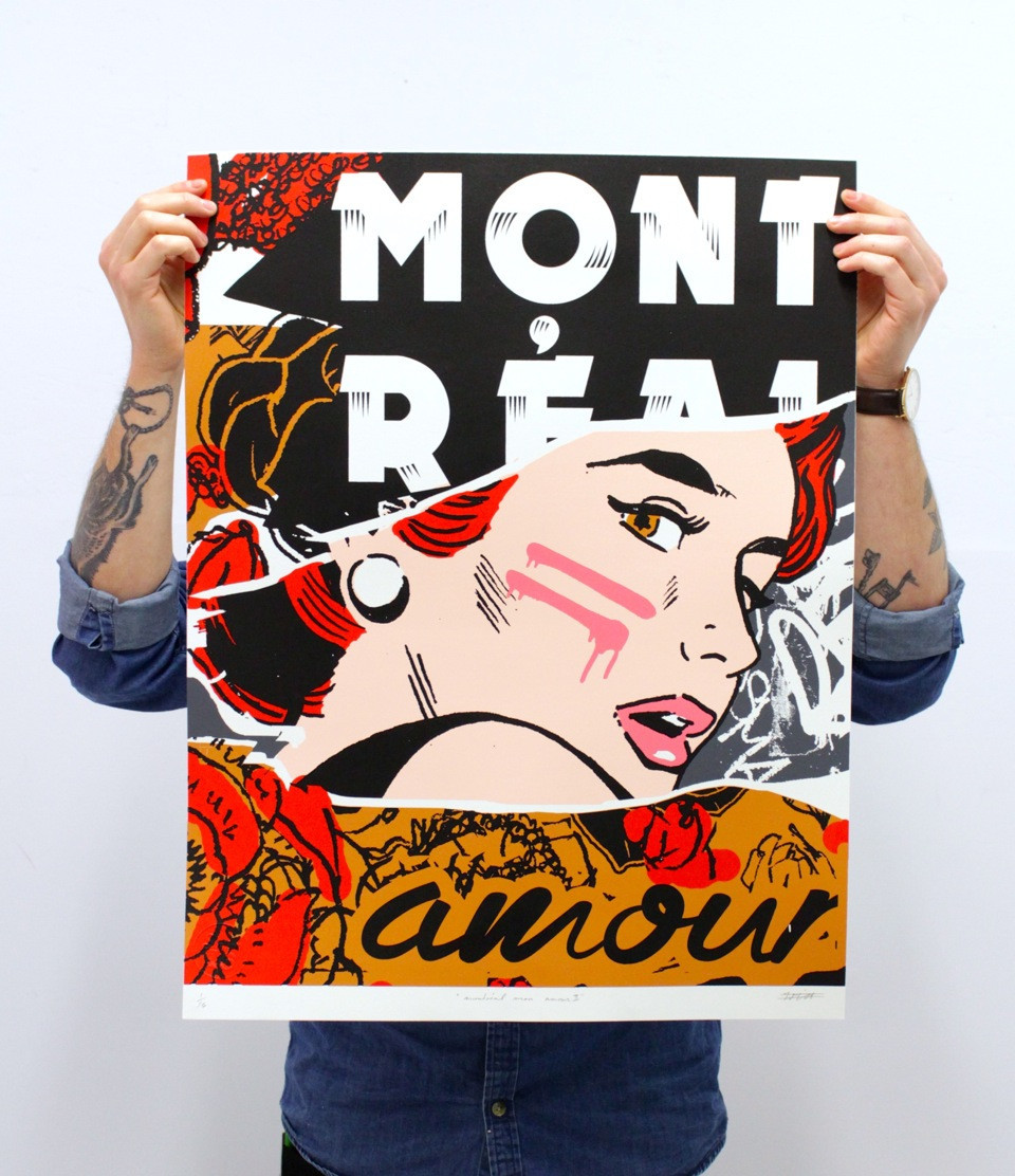 “C’est une image que j’ai créée à cause de mon amour pour la bande dessinée vintage où on trouve beaucoup de poses dramatiques de ce genre. C’est aussi un moyen pour moi d’exprimer mon amour pour cette ville de Montréal que j’aime tellement.”