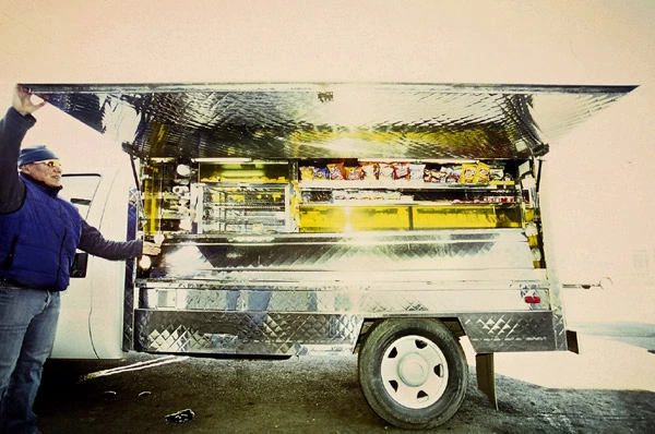 Whim Van Loorhoven est le père de la cantine mobile moderne. Dans les années 1960, l’homme d’affaires a quitté les Pays-Bas pour s’établir dans la belle province et s’est offert son premier truck. Au début de sa carrière, Van Loorhoven servait du café et des sandwichs avec des croûtes sur les chantiers de Côte-Saint-Luc et de Hampstead. C’est lui qui a été le premier à tapisser la boîte de sa cantine de stainless steel pour lui donner son look de palais des glaces. «L’hiver, je perdais beaucoup de nourriture en raison du vent et du froid. Les fourneaux gelaient», se rappelle le vieil homme vêtu d’un sarrau blanc. «Le stainless est rigide et il a permis à ma cantine de résister aux intempéries québécoises.»