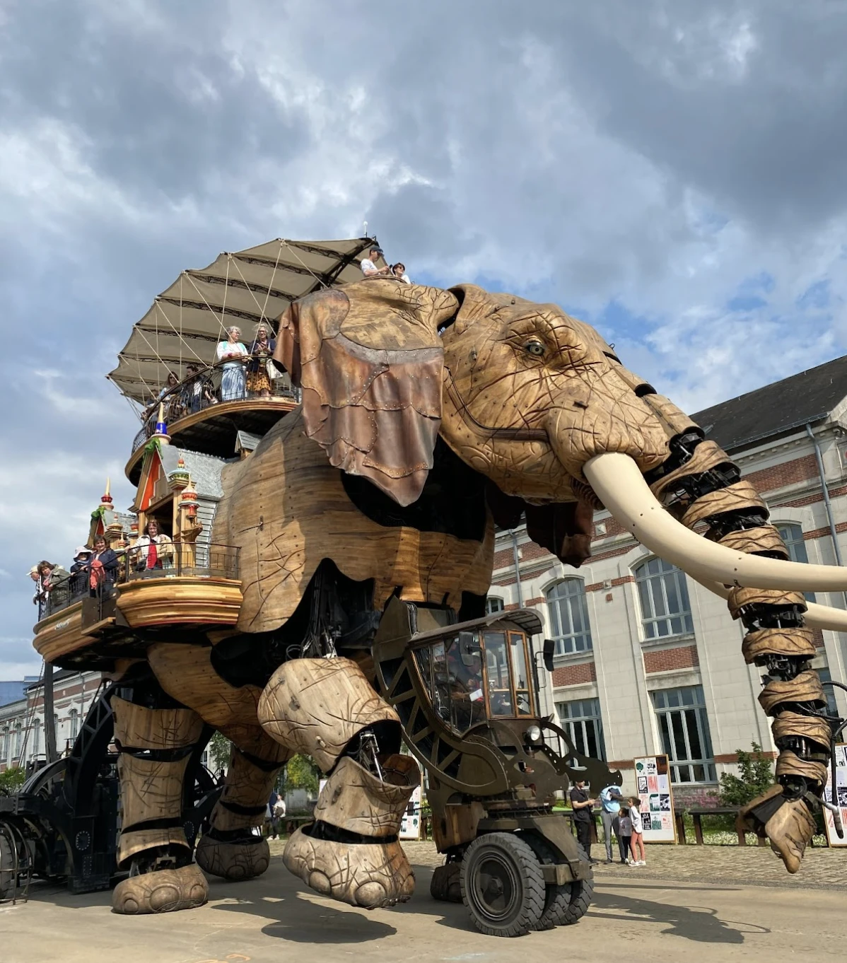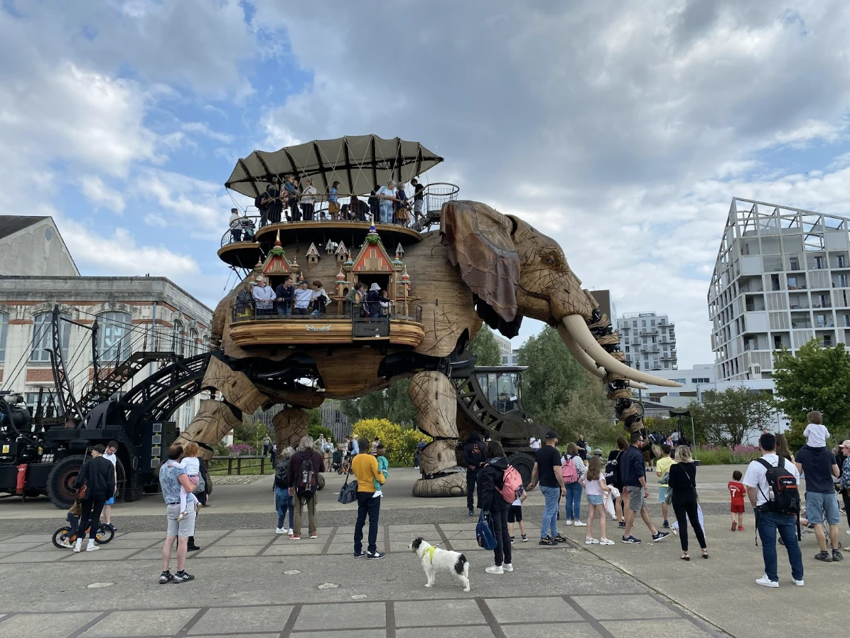 C’est sur le Parc des chantiers que nous attend Le Grand éléphant, dans le quartier Île de Nantes, un lieu autrefois investi par des chantiers navals et l’industrie lourde du commerce maritime situé juste en face de la ville. Le quartier a depuis été revampé avec l’érection d’une zone urbaine consacrée à l’art et à la culture, mais surtout avec la construction d’une attraction phare : les Machines de l’Île d’où surgit le fameux Grand éléphant automate, structure d’acier de douze mètres de haut (et huit mètres de large) fait en peau de Tulipier.