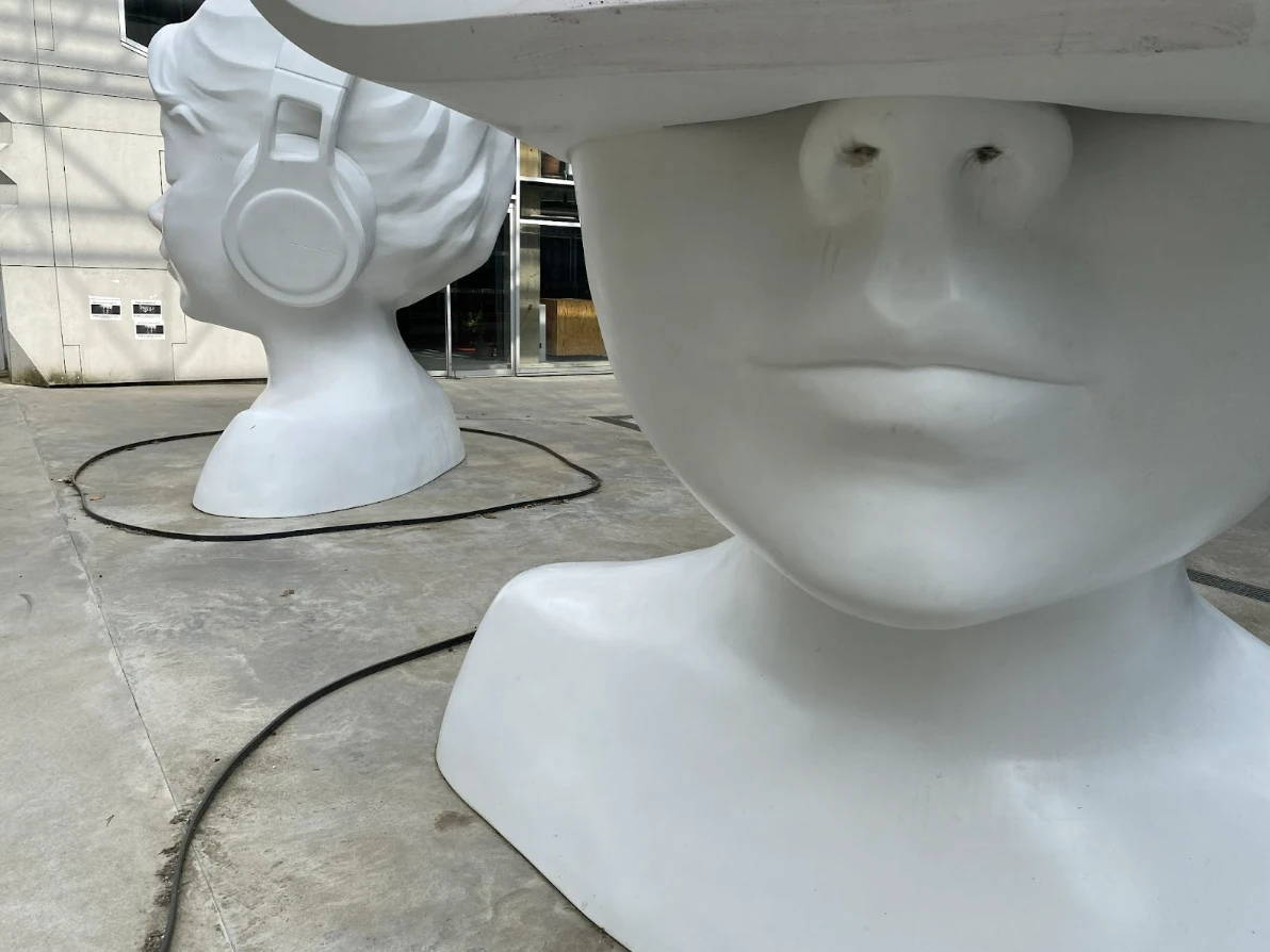 On reste dans le quartier Île de Nantes et on se dirige sur le site des anciennes halles Alstom pour y voir In a Silent Way, une œuvre de Nathalie Talec. . D’une hauteur de plus de trois mètres, elles représentent deux figures féminines au visage juvénile connectées à des écouteurs et un casque virtuel.