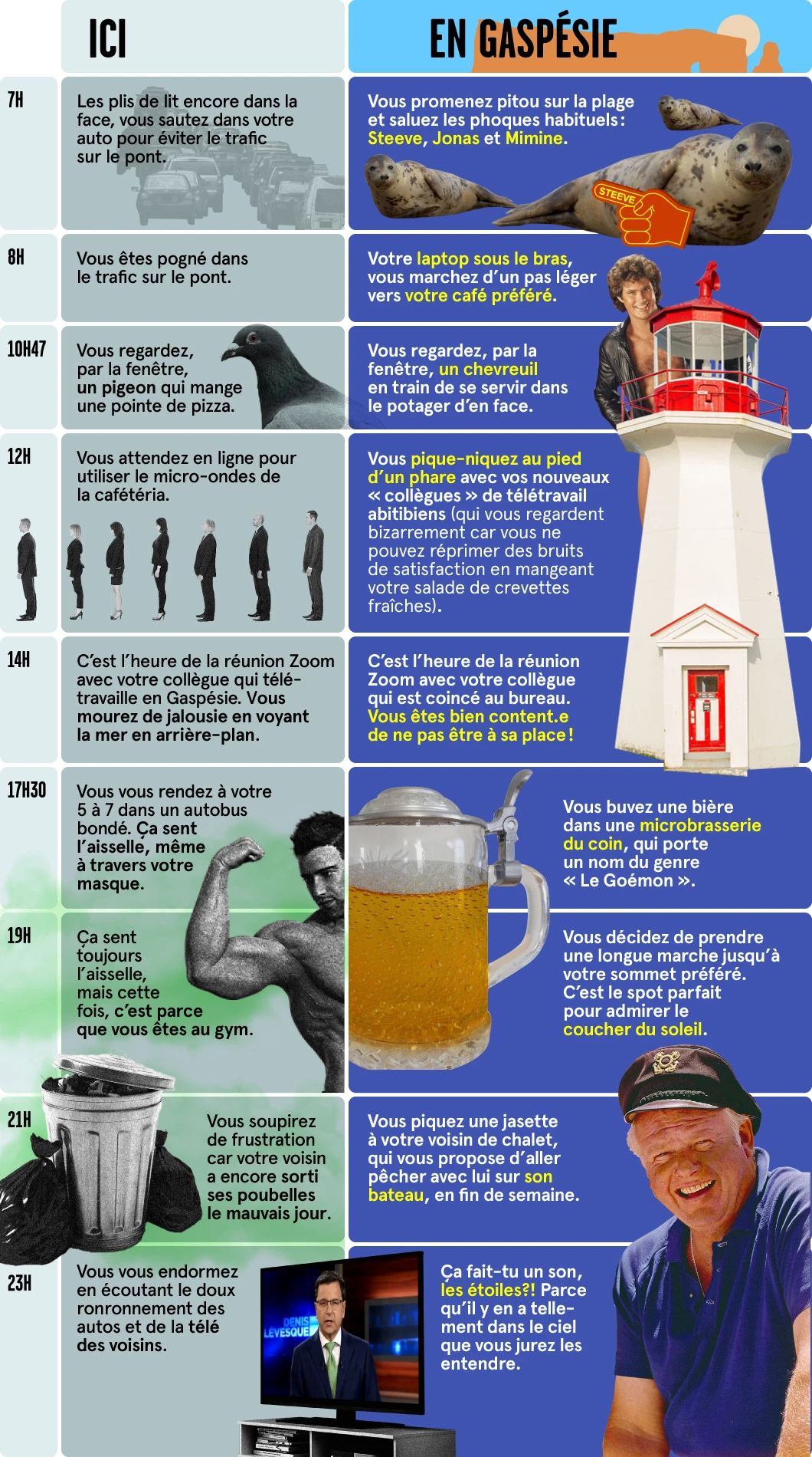 Comment se déroulerait votre journée si vous aviez décidé de rester télétravailler là quelques jours au lieu de rentrer chez vous à la fin de l’été? On a comparé les horaires.