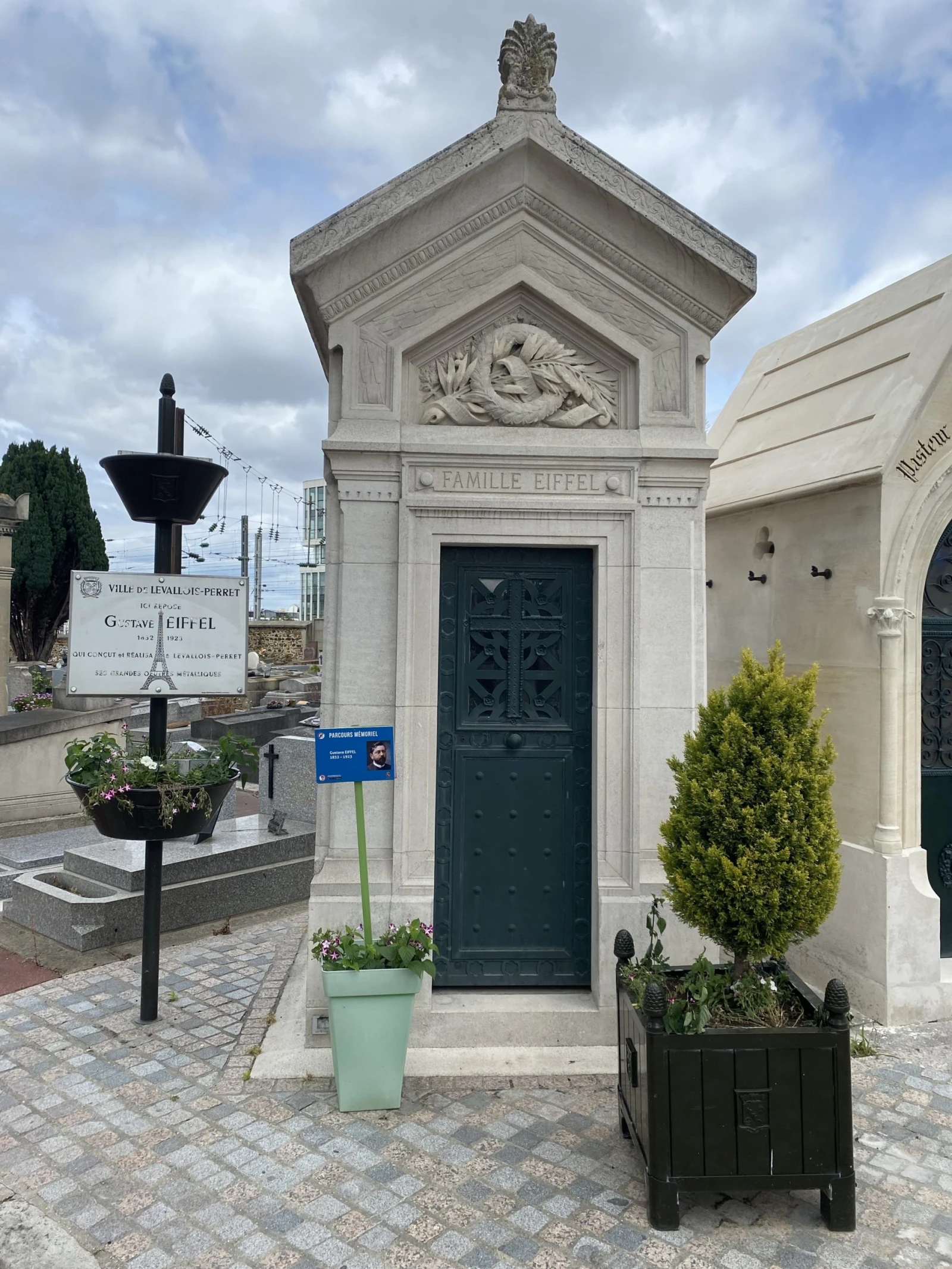 Même s’il ne reste plus grand-chose des ateliers qui ont vu passer dans son âge d’or plus de 400 ouvriers, hormis quelques murs encore debout, un crochet au cimetière de la ville s’impose afin de visiter la tombe du bâtisseur mort en 1923 à l’âge vénérable de 91 ans. Sa sépulture à la particularité d’être tournée vers la Tour qui l’a rendu éternel.