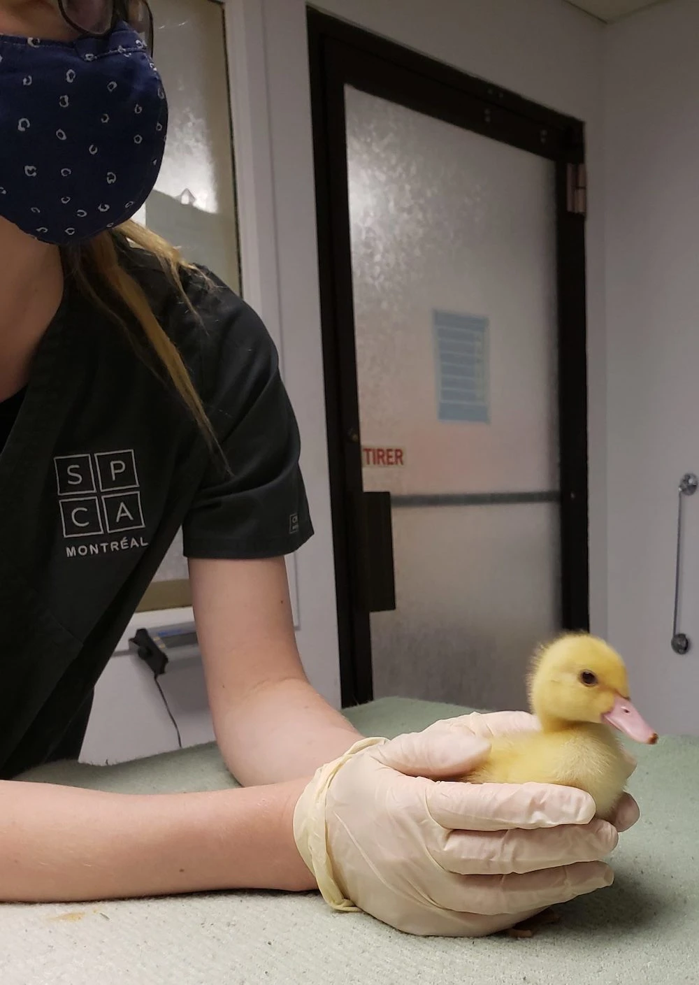 Dans la salle d’examen, on croise un bébé canard au bec abimé. Encore une fois, le masque et les gants ne sont pas un frein à la tendresse de l’employée qui s’occupe de lui. Mon cœur fond un peu.