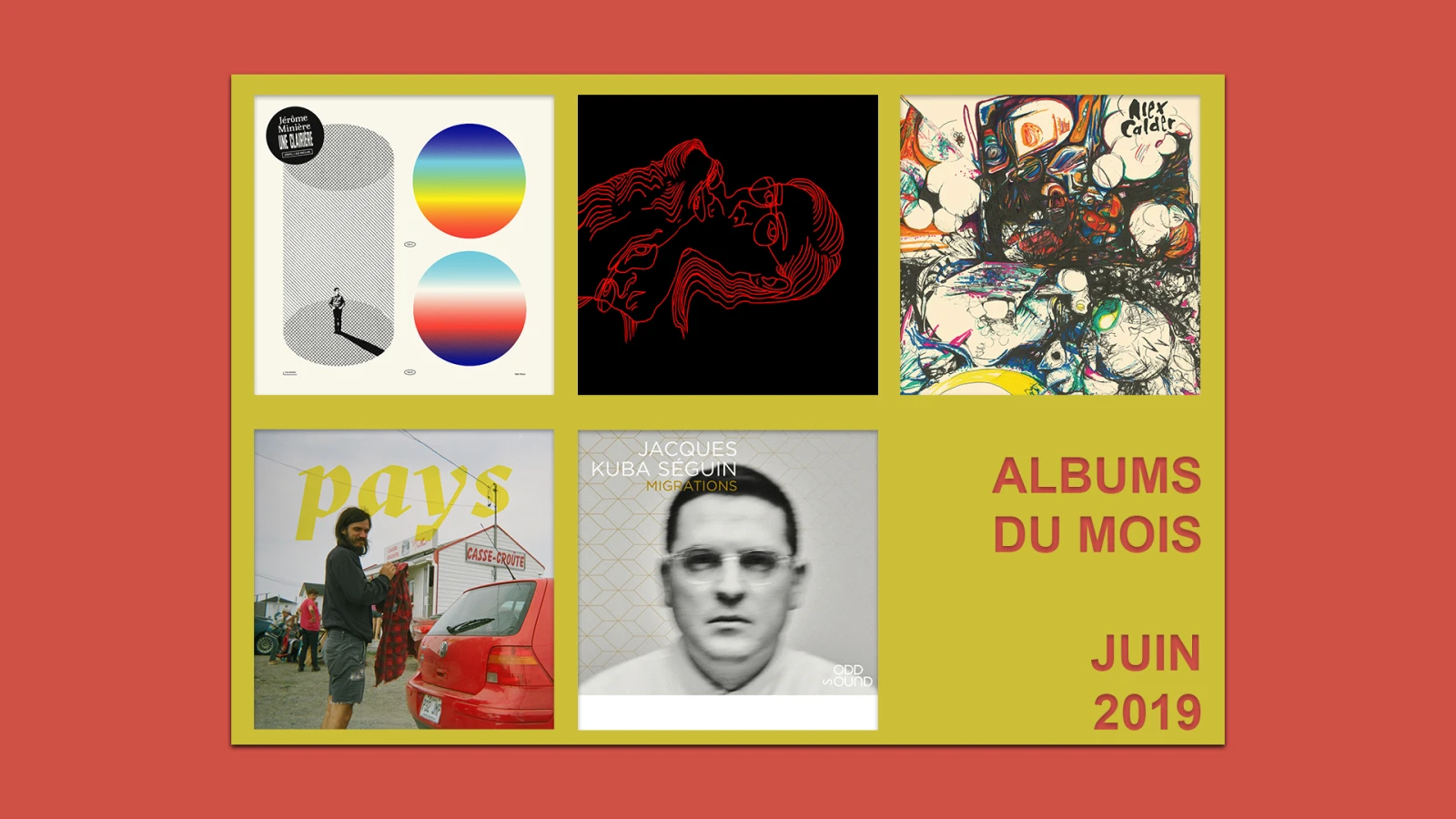 Pour le mois de juin, j’ai opté pour la variété. On va se jaser de folk, de pop, d’électro et même de jazz dans les prochaines lignes! Mes sélections : la touchante production historique de Philémon Cimon, la pop d’orfèvre de Jérôme Minière, le retour surprise d’Alex Calder, les remixes de Lydia Képinski et le toujours efficace Jacques Kuba Séguin.