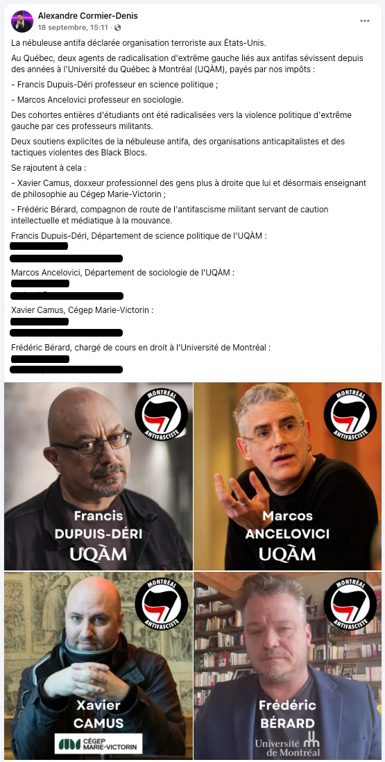 Pour lui, la publication de la liste de Cormier-Denis marque un point de bascule : « Les tactiques trumpistes s’invitent chez nous, le climat a changé. » Ce qui le révolte, c’est surtout la désinformation : « On attaque ma crédibilité de professeur. Je n’ai aucun lien avec une organisation antifasciste… M’accuser de fomenter la violence, de terrorisme, c’est inacceptable. »