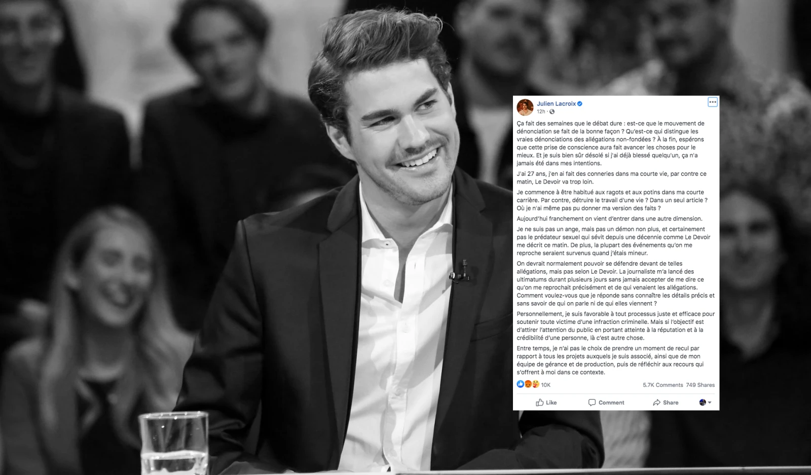 Accusé par neuf femmes, l’humoriste a publié un texte sur sa page Facebook à mi-chemin entre l’excuse et la négation des faits quelques heures après la parution de l’article, remettant même en question la rigueur de la journaliste.