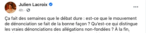 NDLR: La page Facebook de Julien Lacroix a été supprimée au moment de publier cet article. Les captures d’écran de son statut ont été faites la veille de la publication.
