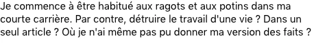 D’entrée de jeu, il y a remise en question la crédibilité d’une dénonciation effectuée sur les réseaux sociaux, en plus de suggérer qu’il y a une « bonne façon » de dénoncer et une moins bonne, selon des critères qui, vraisemblablement, lui sont « valables ou non » dans la distinction entre une « vraie » dénonciation et une fausse.