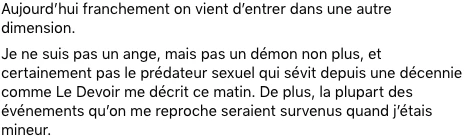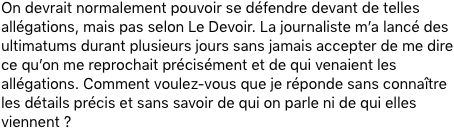 Toujours selon Le Devoir : « Face à une liste DESCRIPTIVE des événements relatés ici, il a fait savoir qu’il considère qu’elle recèle des allégations non fondées et diffamatoires. »