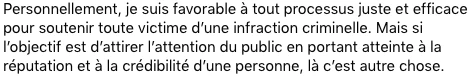 Ajouter un « mais » à la phrase précédente revient un peu à dire « je ne suis pas raciste, mais. » On est favorable à la croyance des victimes ou on ne l’est pas. Encore faut-il définir les critères personnels du principal intéressé afin de décrire sa compréhension d’un processus « juste et efficace ». Le fait même d’utiliser ces mots renvoie à un refus de reconnaissance de ses gestes ainsi qu’à une position de supériorité quant à ce que « devrait » être, selon lui « personnellement », une dénonciation crédible.
