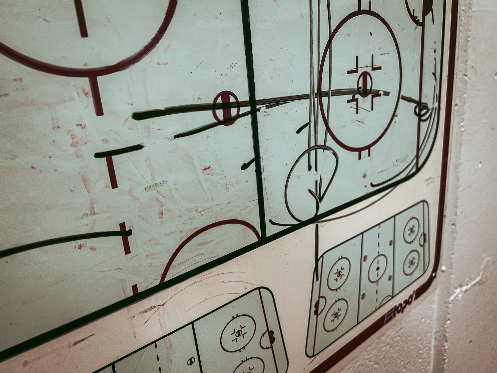 Le regard concentré, Max tape sa palette, la langue sortie. Il enrubanne chaque bandelette avec minutie, au rythme lent d’un bâton délicatement pivoté. L’opération d’une grande précision est pourtant pratiquée sans pantalon, le lunch à l’air. Il en a fait son rituel d’avant-match et toute la chambre aime ça pour la simple raison que « ça fait hockey ». Nul part ailleurs ce serait approprié, mais ici, la scène est magnifiquement cohérente.