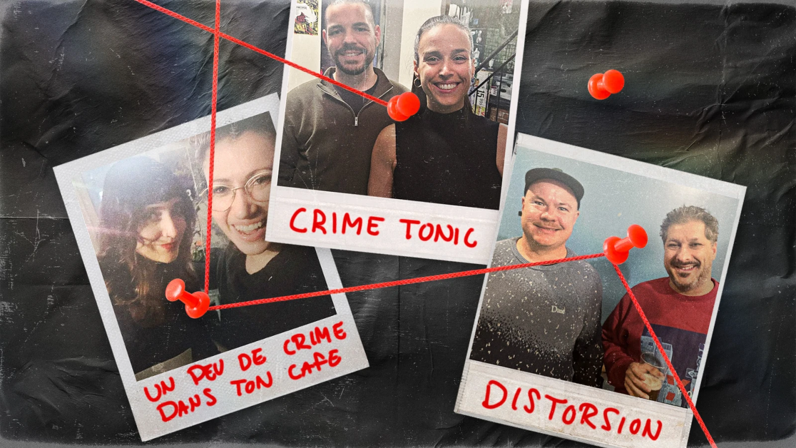 Pendant que je discute avec les membres de Crime Tonic et Un peu de crime dans ton café, Émile Gauthier et Sébastien Lévesque, les animateurs de Distorsion, mangent discrètement leur lunch dans un coin de la pièce pour ne pas nous déranger. C’est soir de fête pour eux aussi, mais ils sont plus habitués à l’exercice. Oeuvrant dans le milieu du balado québécois depuis 2017, ils ont une centaine d’épisodes à leur actif et quelques apparitions publiques, dont une très récente dans le cadre du Festipod, en septembre dernier.