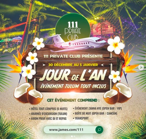 111 Private Club, apprendra-t-on plus tard, est une organisation pilotée (pun intended) par un certain James William Awad. Ce dernier a organisé un voyage dans le Sud du 30 décembre au 5 janvier, conviant un groupe d’influenceurs et de vedettes de téléréalités. Parmi eux, Karl Sabourin d’Occupation Double, ainsi que les candidates de L’île de l’amour Sandrine Séguin, Anna-Maëlle Laprise et Isabelle Labrecque (une pilote!). Ce séjour de rêve qui tournera au cauchemar comprend l’hôtel tout inclus, un avion privé avec DJ et repas, ainsi que différents événements et excursions.