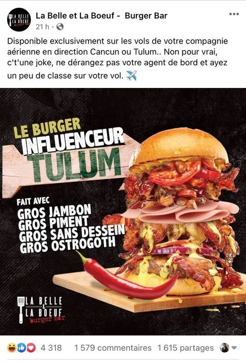 16 h. Le burger bar La Belle et La Boeuf lance leur fameux « Burger Influenceur Tulum » fait à partir de « Gros jambon, gros piment, gros sans dessein, gros ostrogoths ». Si ce n’est pas du pur génie, je ne sais pas quoi vous dire.