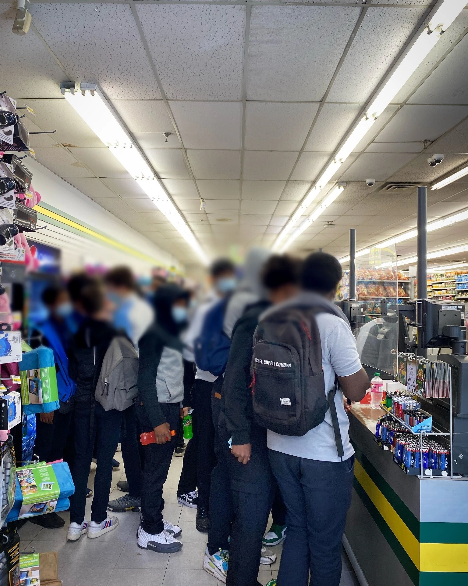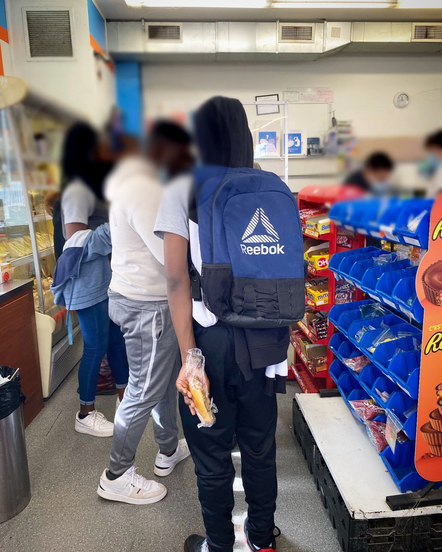 C’est seulement la routine, m’expliquent les commerçants excédés. « Le problème, c’est que pendant qu’un achète quelque chose, les autres en profitent parfois pour voler », souligne Léo, le propriétaire du dépanneur Bellevie juste en face de l’école. Quatre employé.e.s s’efforcent de servir les jeunes qui affluent sans arrêt, tandis que Léo monte la garde près de la porte et tente de maintenir un semblant d’ordre à la caisse. « Mets ton masque! », lance-t-il à un jeune, pendant qu’un employé invite les autres à faire une file qui a de l’allure.
