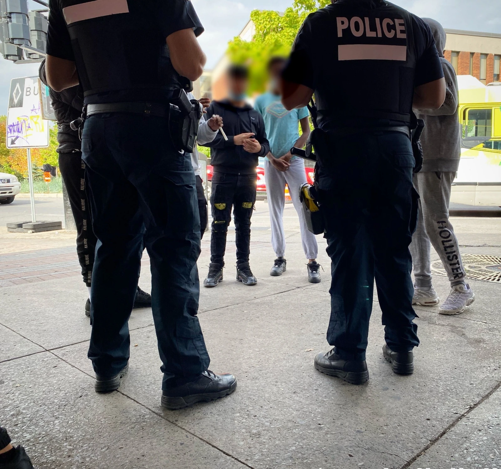 Une autopatrouille s’amène et se gare entre le métro et la pizzeria, rue Saint-Ferdinand. Deux policiers vont voir les jeunes en train de se chamailler pour leur demander poliment de se calmer les nerfs. La suggestion est mal reçue. Les policiers se font vite encercler par les élèves, qui font tout ce qui est en leur possible pour les niaiser copieusement. « On est dans un pays libre! », scandent-ils aux policiers, qui ont l’air découragé.