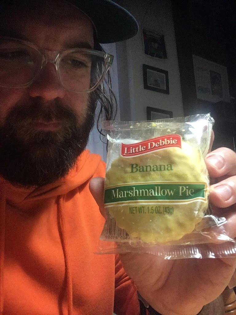 Malgré ce fait scientifique, j’ai quand même été intrigué par la « Marshmallow Pie » aux bananes de la compagnie Little Debbie. Petite tartelette ronde, d’un jaune « motel de Floride 1974 », qui a environ la circonférence d’un couvercle de moyen ( 2-1 ) chez Tim.